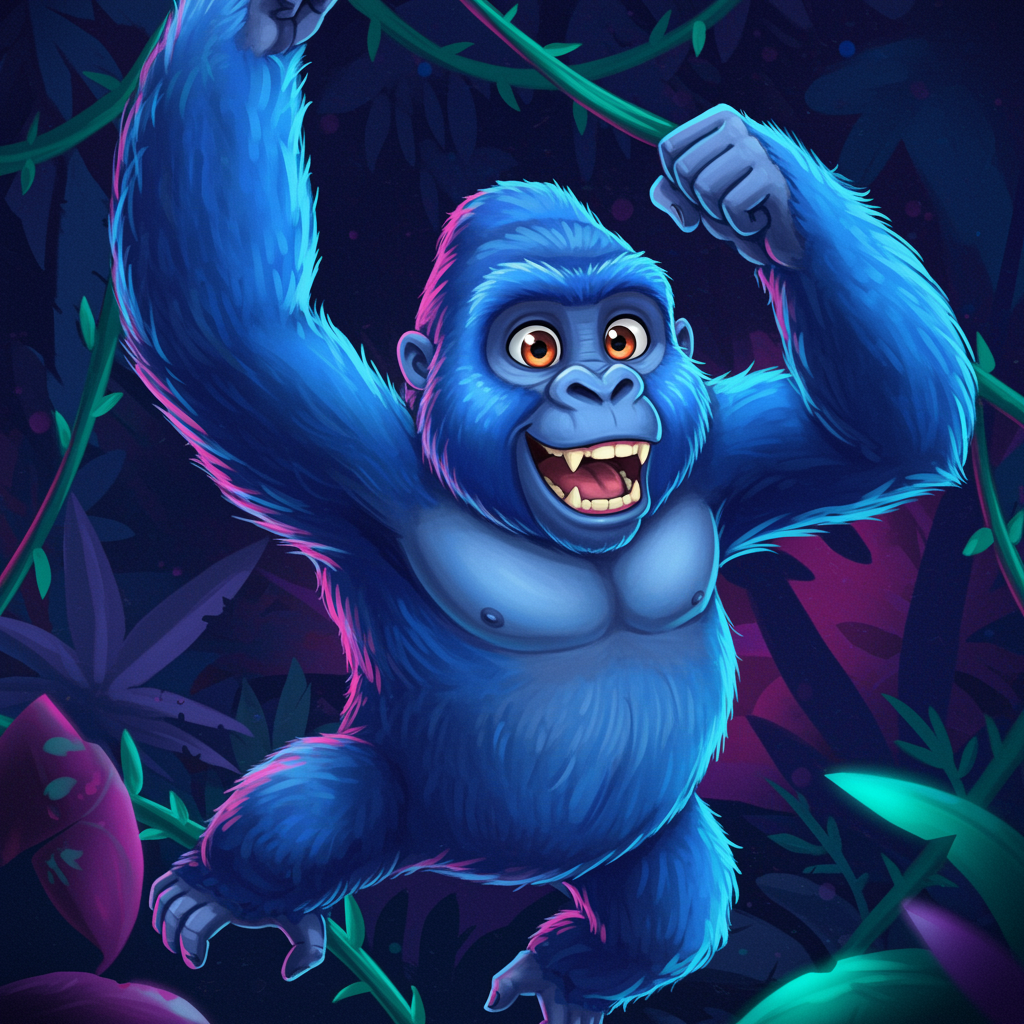 A dynamic profile picture of a blue gorilla, its fur shimmering like the ocean under the moonlight, showcasing a playful grin as it swings energetically through a dreamy neon jungle; its expressive eyes reflecting a universe of mischief and adventure, with digital vines creating an intricate background pattern that perfectly captures the spirit of a modern, tech-savvy explorer.