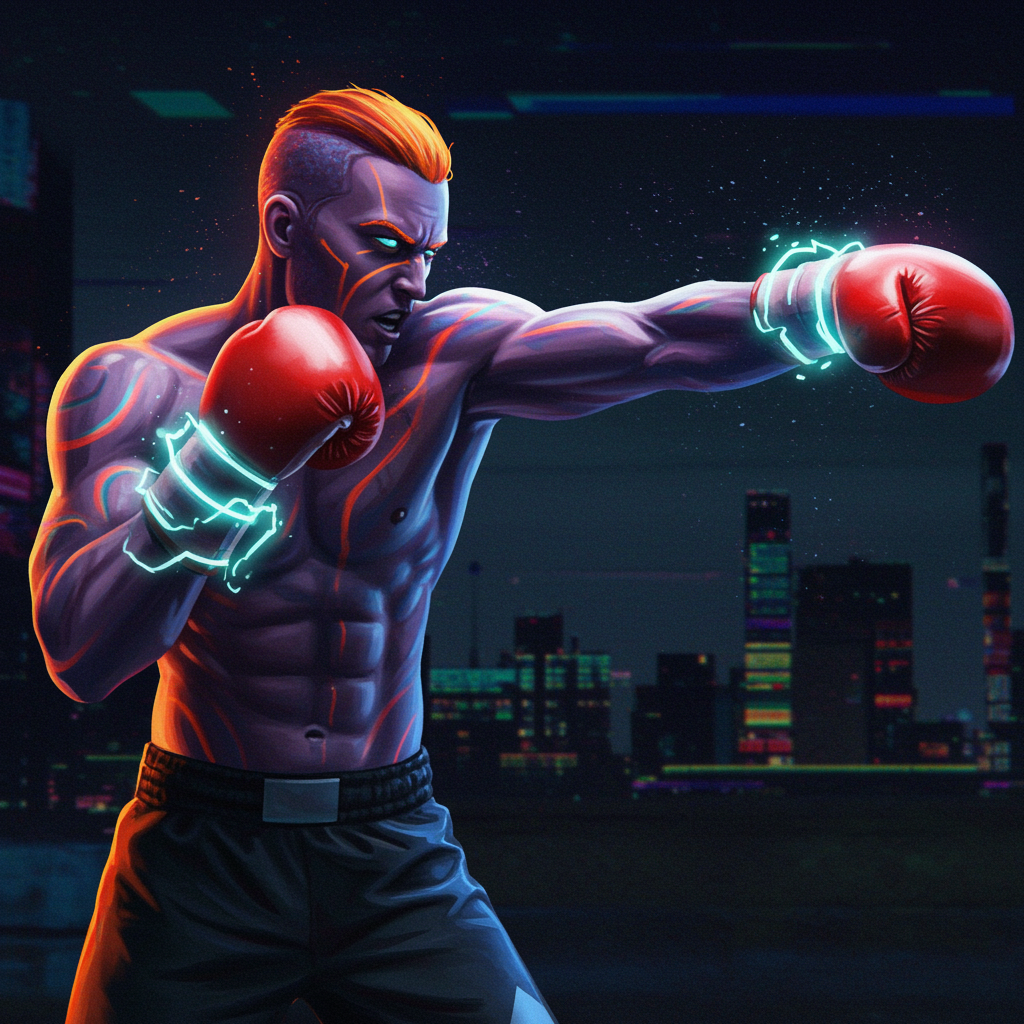 A dynamic and captivating profile picture featuring a futuristic cyberpunk boxer with neon-tinted skin, in mid-punch with vibrant electric gloves, set against a backdrop of a digital cityscape glitching into the sky, capturing motion and energy, embodying both strength and technology in a mesmerizing display.