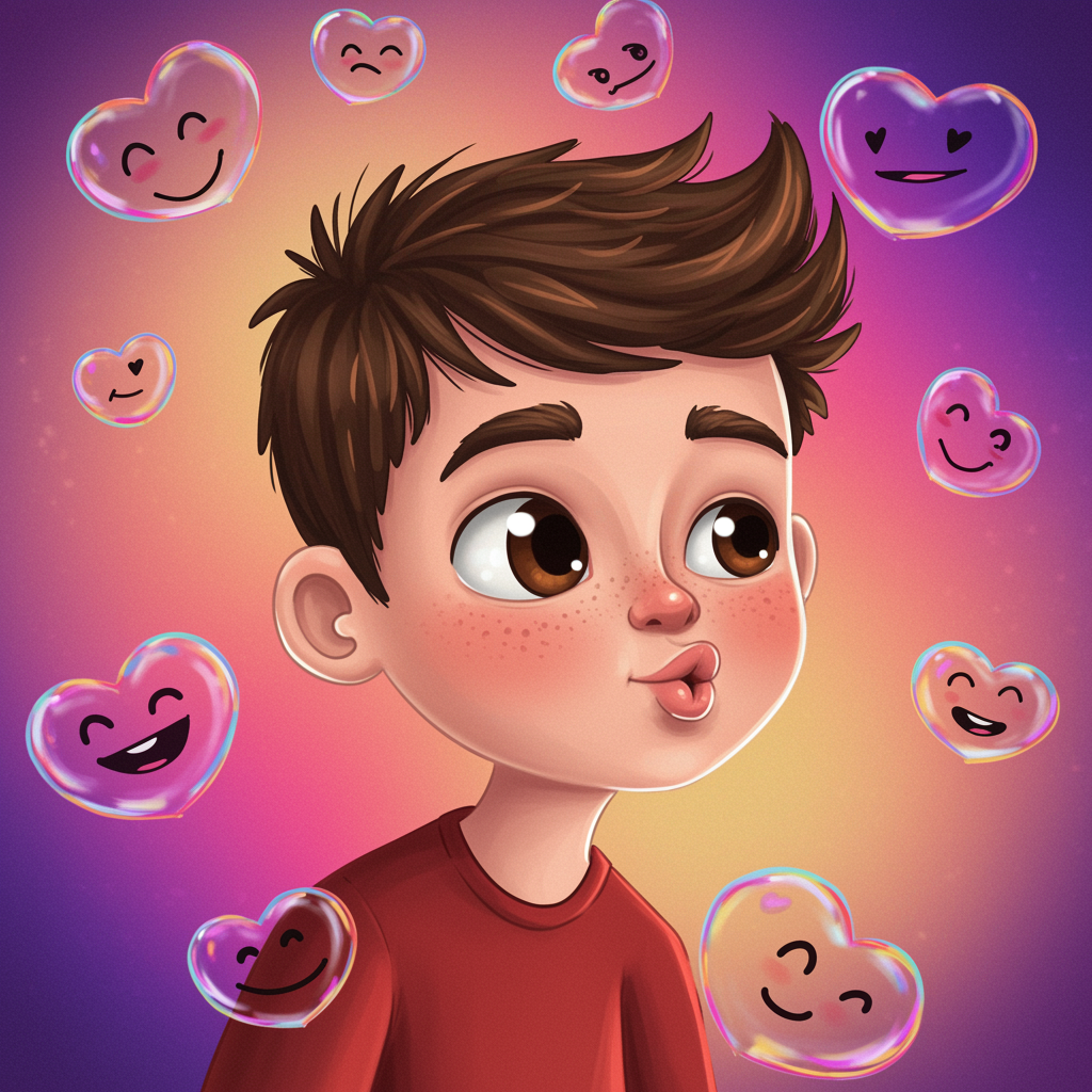 A whimsical scene of a playful cartoon boy surrounded by floating heart-shaped bubbles, each bubble reflecting joyful expressions and vibrant colors blending into the background; the boy's face is turned towards the viewer with a cheeky, knowing smile, his eyes sparking with mischief and kindness, and his lips puckered slightly as if about to blow a kiss, capturing an innocent and light-hearted essence perfect for a social media profile that radiates warmth and friendliness.