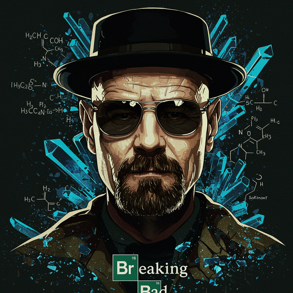 A gritty, abstract profile picture featuring a stylized portrait of Walter White, wearing sunglasses and his iconic black hat, with chemical formulas and blue crystal shards subtly woven into the background, symbolizing his descent into the dark world of chemistry and crime, capturing the essence of "Breaking Bad" with an aura of mystery and intrigue.