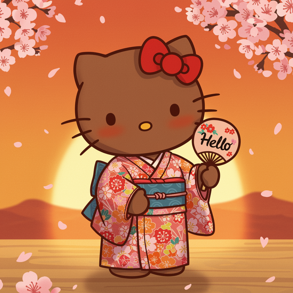 A whimsical profile picture featuring a brown-skinned Hello Kitty adorned in a vibrant, floral-patterned kimono, her bow replaced with an intricate butterfly. She is set against a warm sunset backdrop with cherry blossoms gently swirling around her. Her eyes sparkle with friendliness, and she holds a tiny, hand-painted fan with the word "hello" in elegant script, embodying a blend of cultural charm and timeless cuteness.