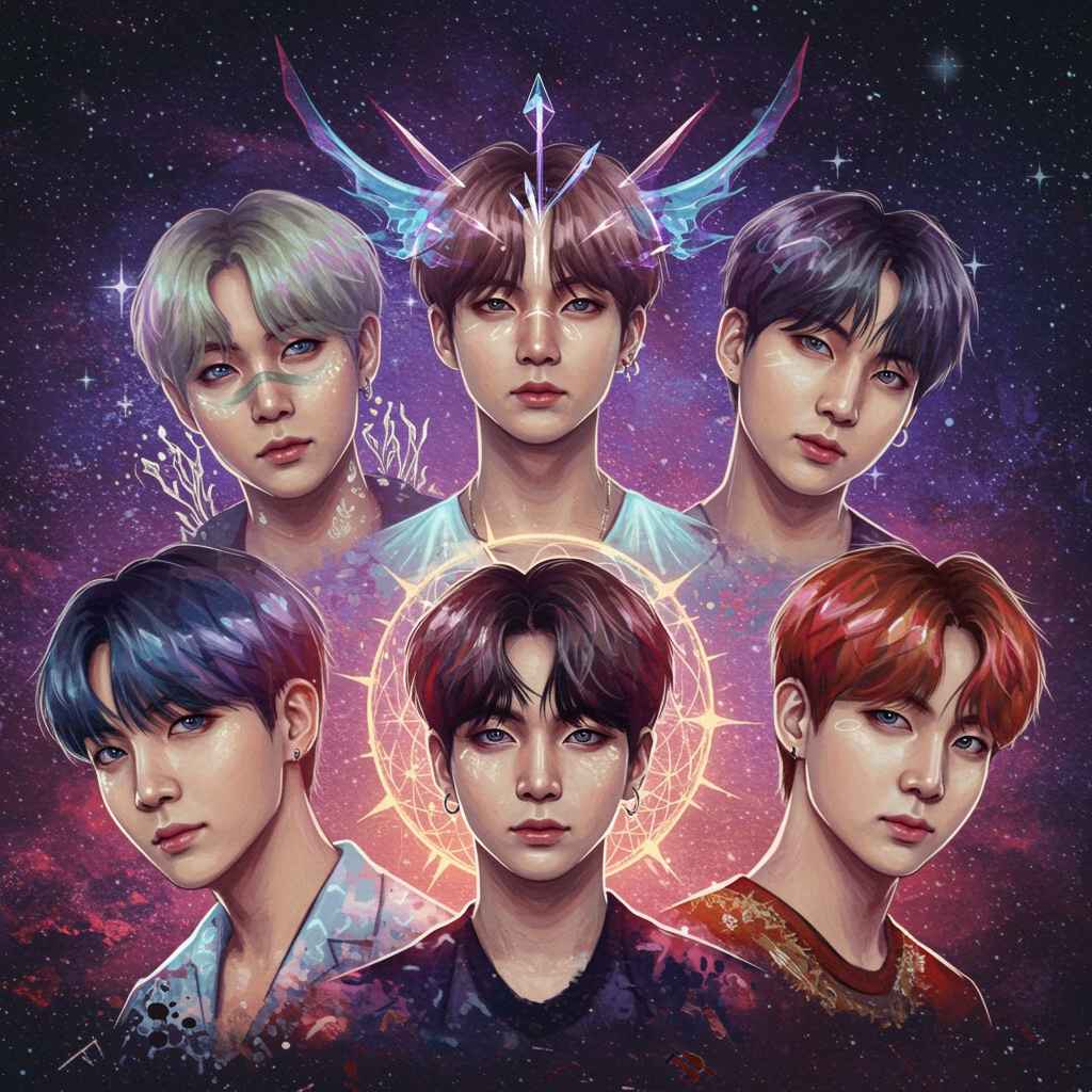 "An ethereal scene where each member of BTS is portrayed as mythical beings, their essence captured in surreal colors and dynamic patterns, with each face artistically merged with elements representing their unique personality and music style, all against a celestial backdrop that suggests a universe shaped by creativity and harmony, encapsulating the spirit of a BTS pfp that resonates with fans around the world."