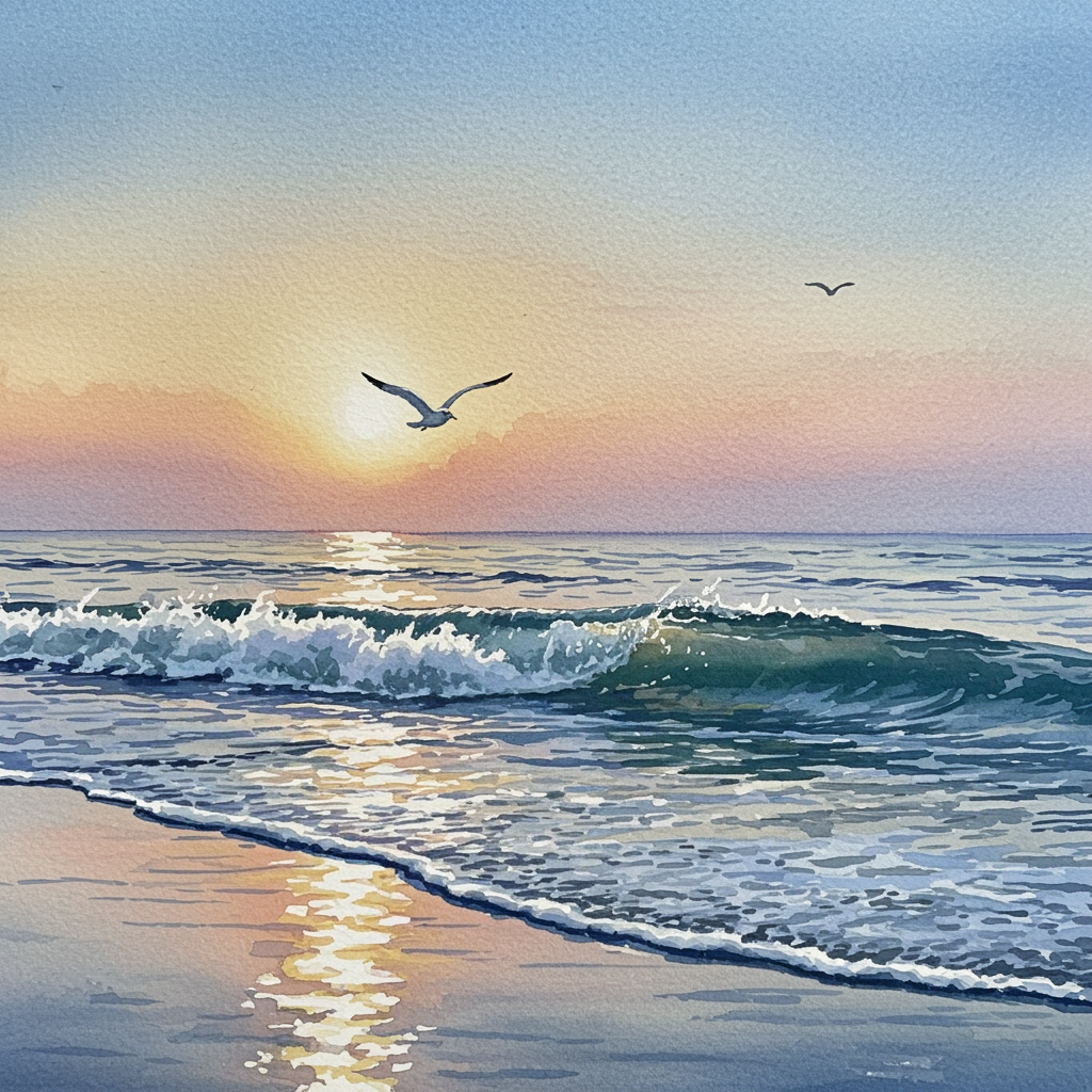 A serene watercolor scene of a gentle ocean wave softly lapping against the shore at sunset, with pastel hues reflecting in the tranquil sea and a lone seagull gracefully soaring in the background.