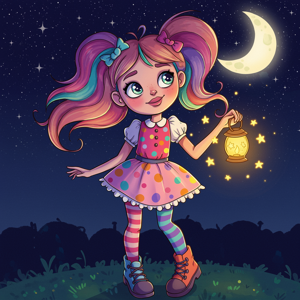 A vibrant cartoon girl with wide, expressive eyes stands under a starry night sky, her hair flowing like waves of colorful candy; she's adorned in quirky, mismatched fashion - a bright polka dot dress, striped stockings, and checkered shoes - each element bursting with character; her playful smile glows with intrigue and wonder as she holds a small lantern that emits whimsical shapes of light, capturing a sense of magical adventure and youthful charm in the cool moonlit night.