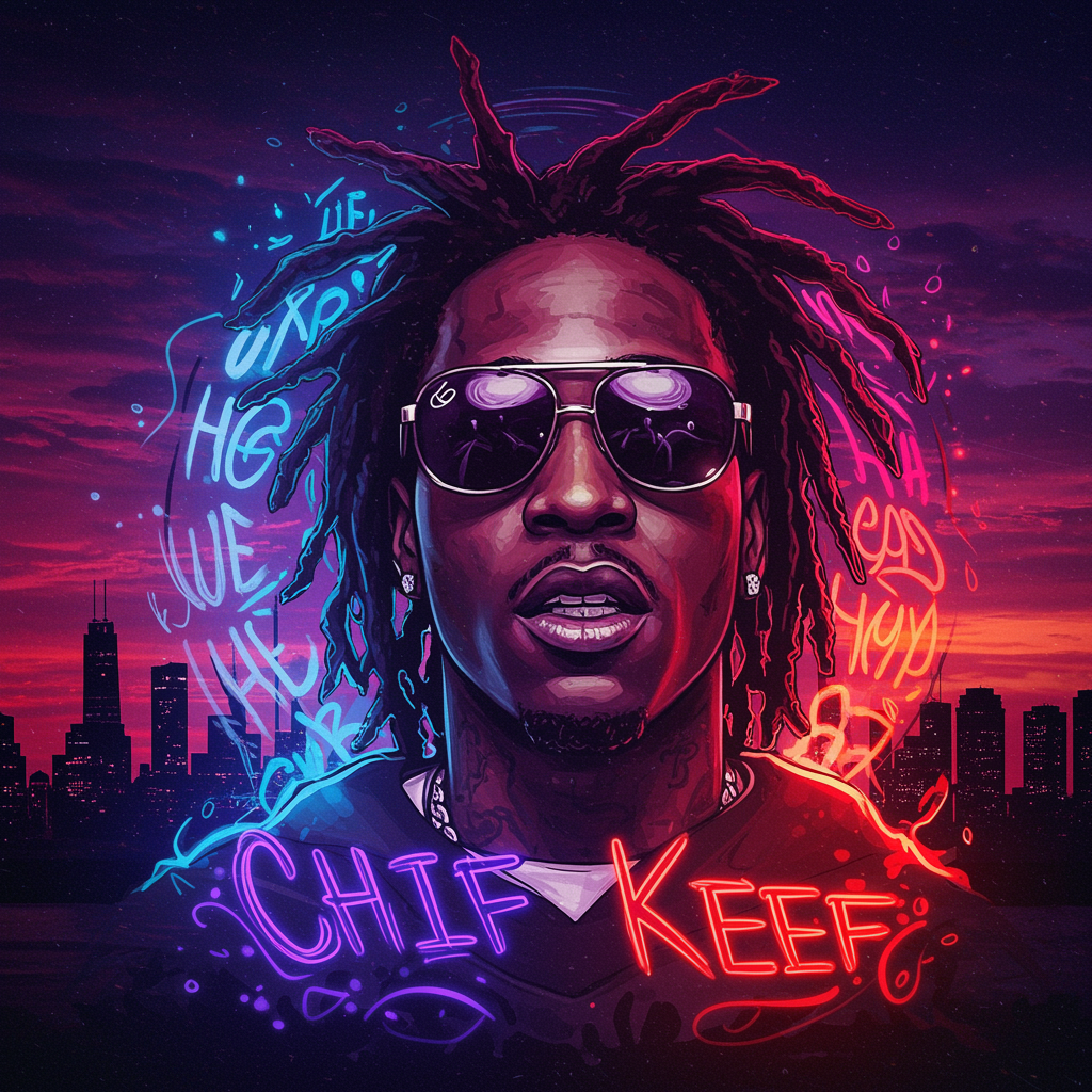 Imagine a vibrant and dynamic profile picture that captures the essence of Chief Keef's energy and style. The image features a stylized digital portrait of Chief Keef surrounded by swirling neon graffiti that spell out his iconic lyrics. Behind him, a city skyline at dusk is visible, with silhouetted skyscrapers and a glowing horizon. Chief Keef is depicted with his signature sunglasses and a confident expression, his dreadlocks animated as if caught mid-motion. The palette blends hues of deep purples, electric blues, and fiery reds, creating a contrast between the urban backdrop and his larger-than-life persona. This pfp radiates the rebellious spirit and creative flair of Chief Keef, making it an unforgettable representation for any social media profile.