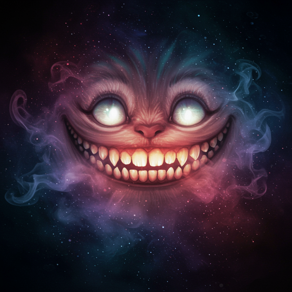 Imagine a whimsical profile picture that features a surreal, floating grin inspired by the Cheshire Cat, hovering against a backdrop of swirling, cosmic colors. The smile is both mischievous and endearing, glowing with an otherworldly luminescence. Its sharp, gleaming teeth reflect a hint of mystery, enticing viewers with a sense of playful enigma. Wisps of ethereal smoke curl around the edges of the mouth, adding to the aura of dreamlike wonder, as if the smile itself exists in a realm where imagination knows no bounds.