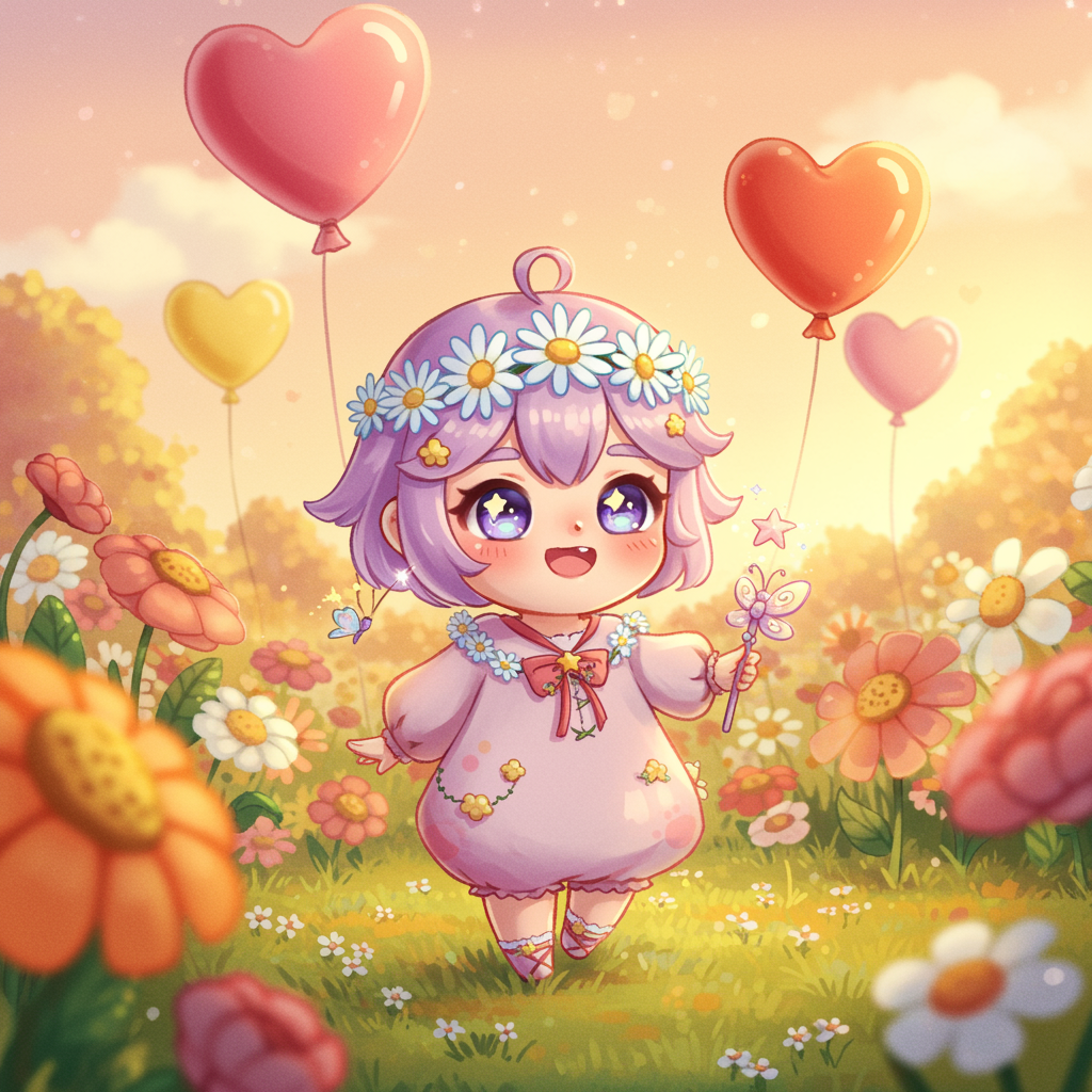 A vibrant, pastel-colored chibi character standing in a whimsical garden filled with oversized flowers and floating heart-shaped balloons, the character has sparkling eyes and an exaggerated, joyful expression, wearing a tiny crown made of daisies and holding a miniature enchanted wand, a tiny butterfly gently landing on its shoulder, the entire scene bathed in a warm, golden glow as if captured during a magical sunset.