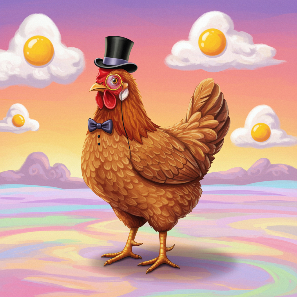 Imagine a charismatic chicken with a larger-than-life personality captured in a vibrant, abstract art style. This feathered character is adorned with a miniature top hat tilted jauntily, a monocle glinting in the sun, and a tiny bow tie nestled perfectly under its beak. The chicken stands proudly on a colorful terrain made of swirling pastel hues, with its wings slightly outstretched as if mid-conversation. In the background, playful, whimsical clouds shaped like cartoon eggs drift through a sky painted in a kaleidoscope of sunset colors.
