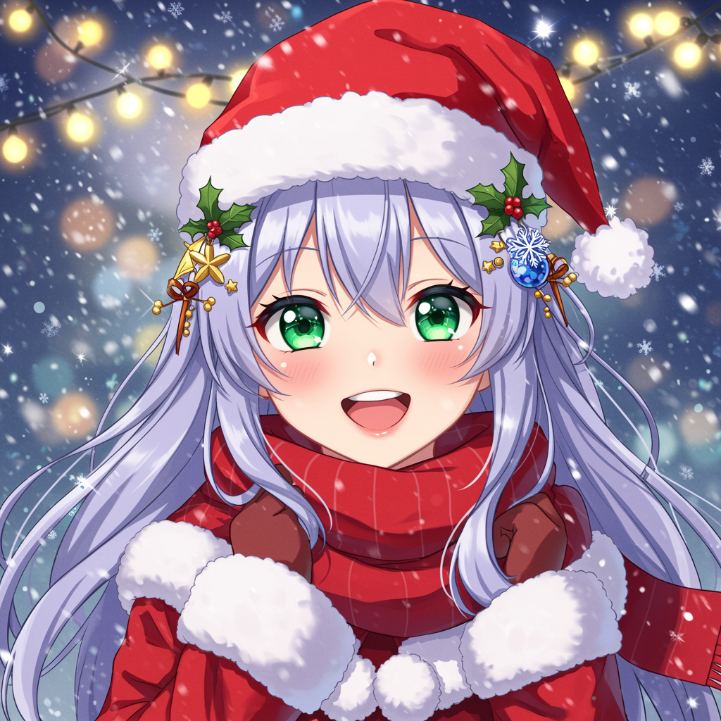 A whimsical Christmas anime girl with sparkling emerald eyes peeking out from under a fluffy Santa hat, her long, flowing lavender hair adorned with tiny snowflake ornaments, she wears a cozy red and white scarf that matches her festive holiday outfit, surrounded by softly falling snowflakes and twinkling fairy lights, her wide grin and rosy cheeks radiate warmth and joy in a magical winter wonderland background, an ideal festive profile picture full of holiday spirit and anime charm.