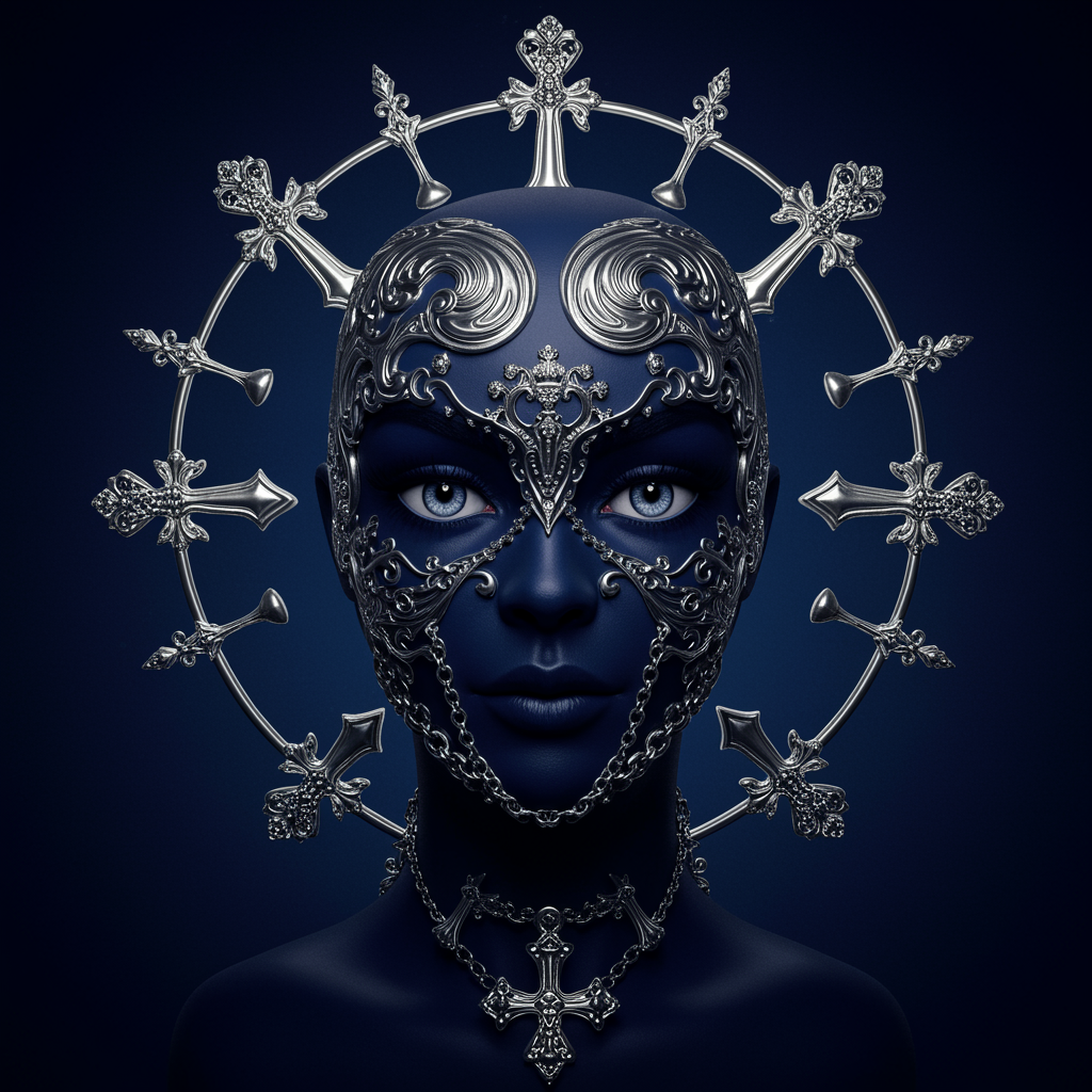 A sleek profile picture featuring a digital avatar adorned with intricate chrome jewelry inspired by the iconic Chrome Hearts aesthetic, the avatar's eyes glimmer with metallic hues, surrounded by a halo of stylized silver crosses and gothic elements, set against a deep midnight blue background that adds depth and mystery to the image.