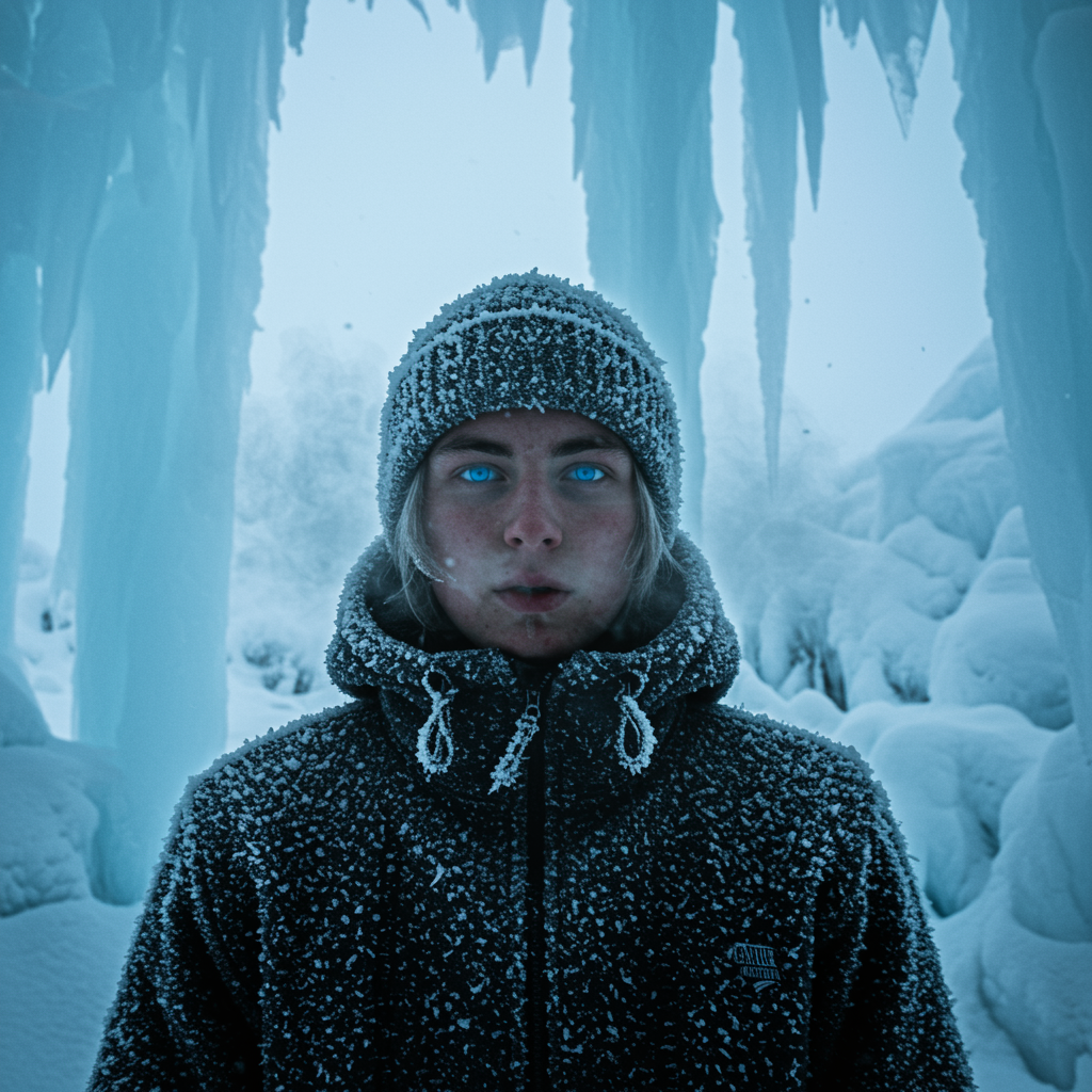 A frosty silhouette of a solitary figure standing against a backdrop of ethereal ice formations, their breath visible in the crisp air as it swirls like a gentle whisper, mirrored by the sparkling frost on their winter attire, their eyes a cool, piercing blue, reflecting the serene, otherworldly beauty of the cold landscape around them.