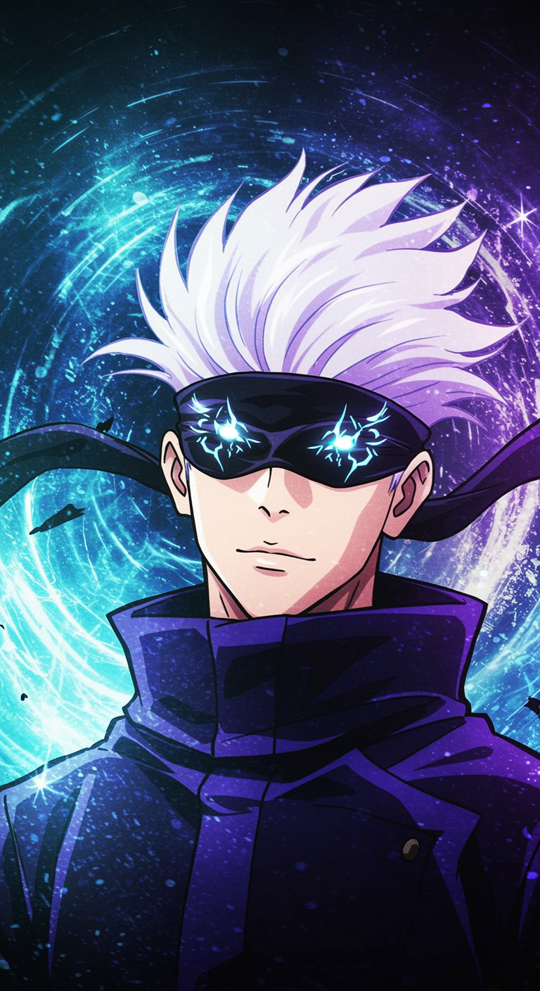A sleek and dynamic profile picture featuring Gojo Satoru from the anime Jujutsu Kaisen, his iconic white hair styled effortlessly as it flutters in an imaginary breeze. His blindfold is artistically designed with intricate patterns that glow softly, hinting at his immense power. In the background, a swirling vortex of vibrant colors—blues, purples, and silvers—reflects a sense of mystery and intensity, capturing the essence of his cool demeanor. The entire composition is infused with an ethereal luminescence, giving the impression that Gojo is both part of this world and beyond it, embodying an enigmatic and captivating aura.