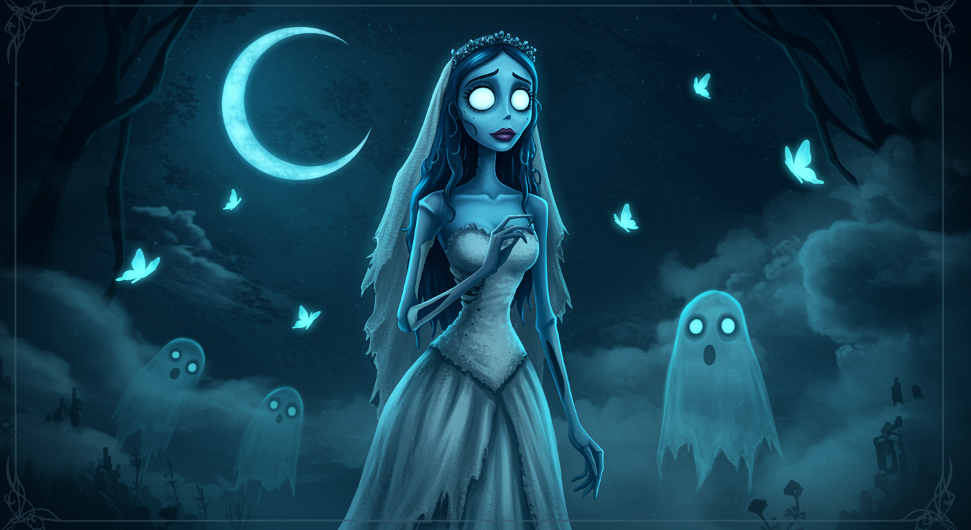 A hauntingly beautiful profile picture captures a whimsical, gothic illustration of a Corpse Bride with luminescent blue skin and glowing eyes; her flowing tattered wedding gown melds into a background of swirling mist, dotted with ethereal spectral butterflies, all under a crescent moon casting a ghostly glow over her serene, melancholic expression.