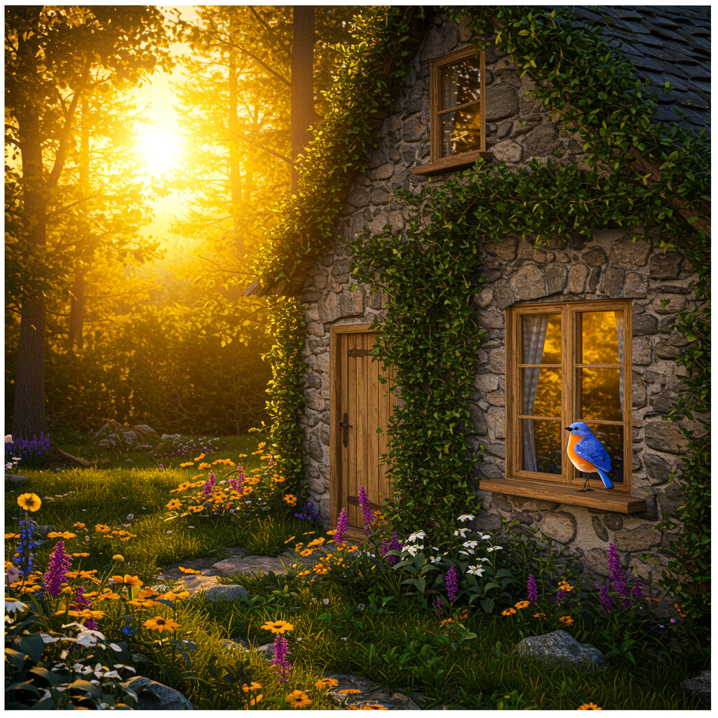 A serene cottage nestled in a lush, enchanted forest bathed in the golden glow of a setting sun, ivy-covered stone walls, vibrant wildflowers swaying gently in the breeze, and a whimsical bluebird perched on a rustic wooden windowsill, exuding a sense of tranquility and rustic charm for an enchanting cottagecore pfp.