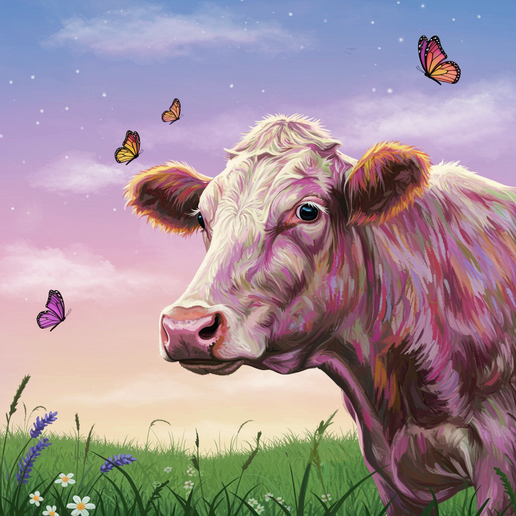 Imagine a whimsical cow with artfully oversized eyes, adorned in vibrant, dreamlike colors that swirl around its face, standing in a lush meadow under a fantastical, pastel-hued sky, while playful butterflies flit around its serene aura, capturing the essence of calm and curiosity in a profile picture silhouette.