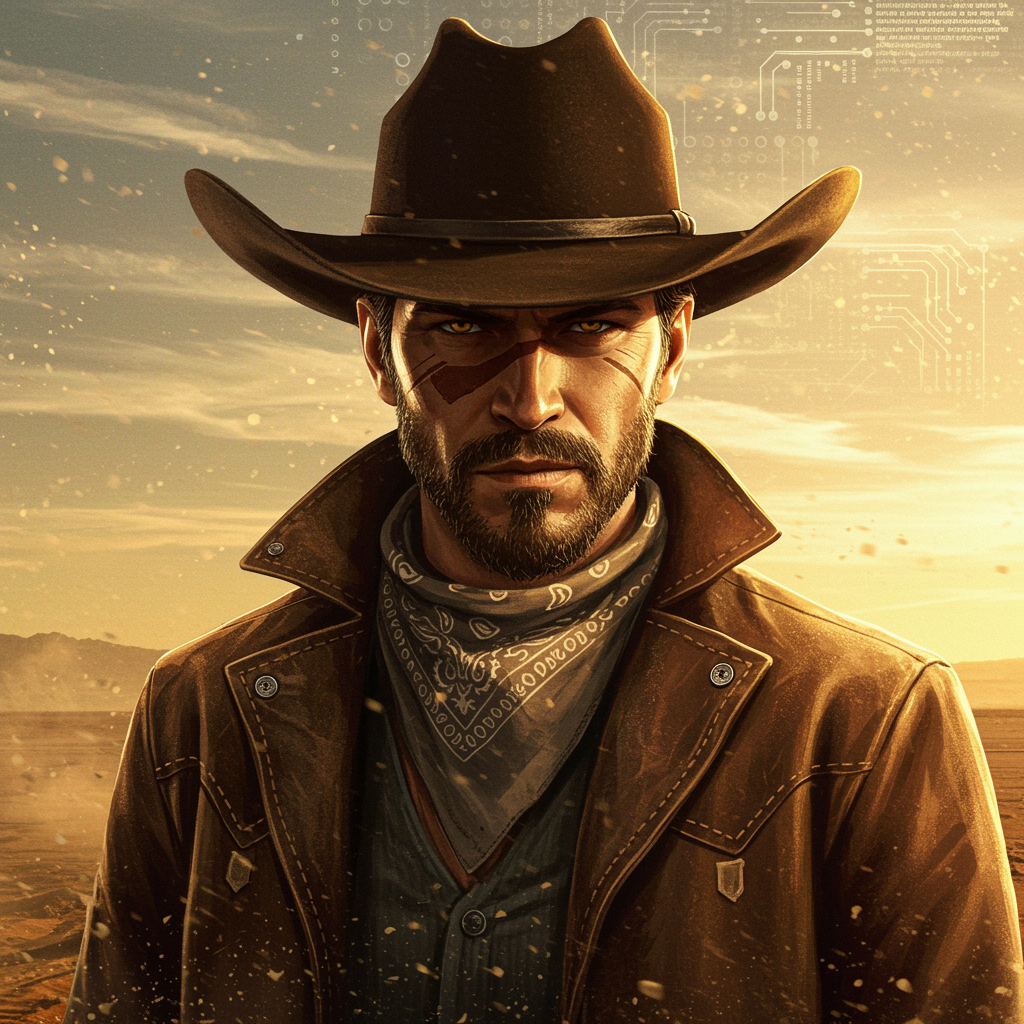 Create an image of a charismatic cowboy with a modern twist; his hat slightly tilted at a jaunty angle, the brim casting a mysterious shadow across his eyes, which are confident and piercing. His attire blends traditional western elements with contemporary style, featuring a leather jacket with intricate stitching and subtle metallic accents, paired with a sleek bandana. The background is a vast, sunlit desert landscape that transitions into stylized digital circuitry patterns, suggesting a fusion of rustic charm and futuristic flair. Dust swirls gently around him, illuminated by the golden hour light, adding an aura of adventure and mystery, making this the perfect cowboy pfp.