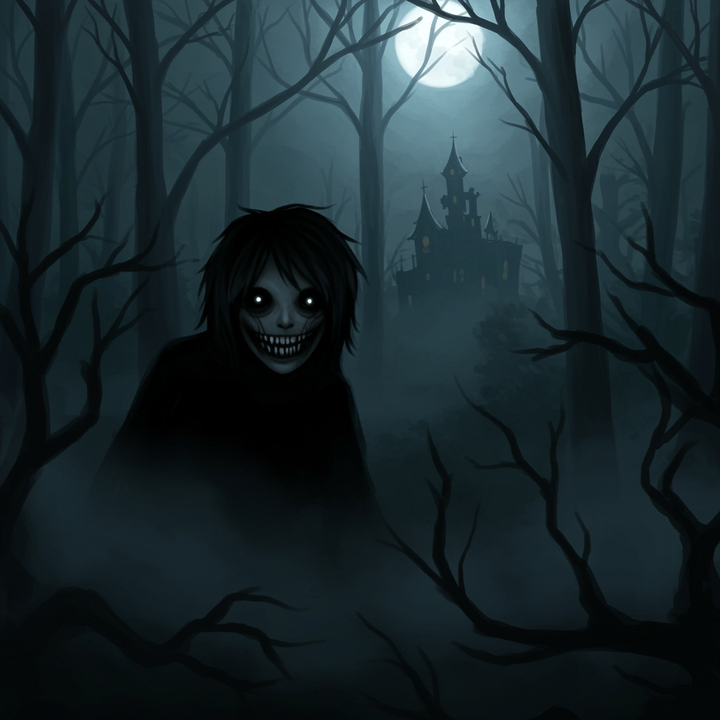 An eerie, moonlit forest shrouded in mist forms the backdrop for a figure that sits on the boundary between reality and nightmare; a pale, grinning face with glowing eyes peers out from the shadows, its expression an unsettling mix of mischief and malevolence. The figure’s silhouette is cloaked in tattered, shadowy garments that seem to blend into the darkness of the woods, giving it an almost ghostly appearance. Branches appear to twist and curl towards the figure as if drawn to its dark allure, while the faint silhouette of a distant, decrepit mansion looms in the background, hidden among the trees. This portrayal captures the essence of a "creepypasta pfp," offering a chilling yet captivating glimpse into the world of internet horror lore.