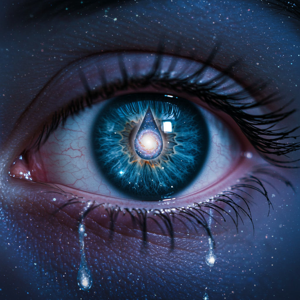 A beautifully melancholic profile picture featuring a teardrop-shaped galaxy floating in the eye of an ethereal being, with shimmering stars cascading down like tears, set against a backdrop of swirling cosmic hues of blue and purple, evoking a sense of deep emotion and universal connection.
