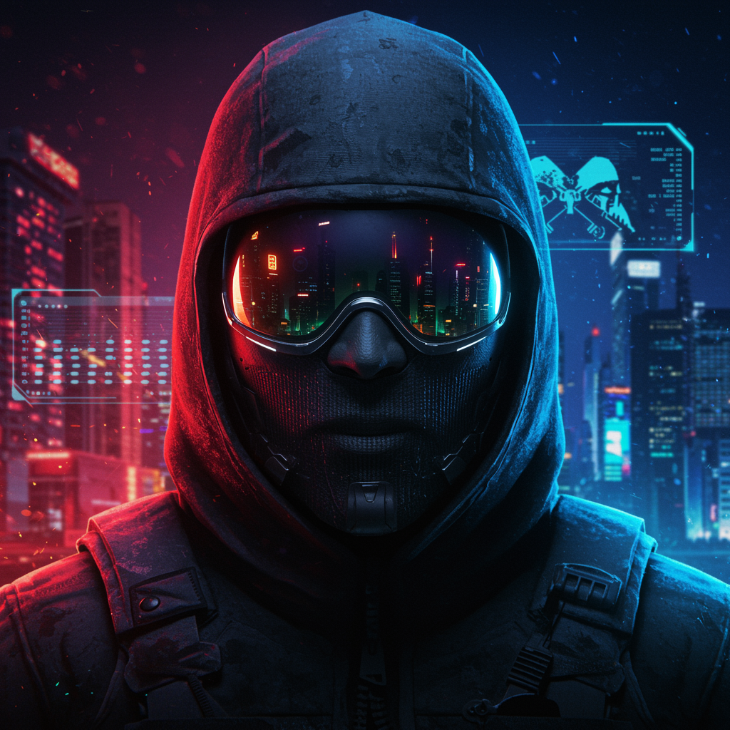 A stylized, neon-lit cyberpunk cityscape reflecting in the visor of a masked counter-terrorist reflecting a blend of futuristic tech and classic CS:GO elements, with holographic scores in the background and subtle nods to the game's iconic map locations in the abstract skyline.