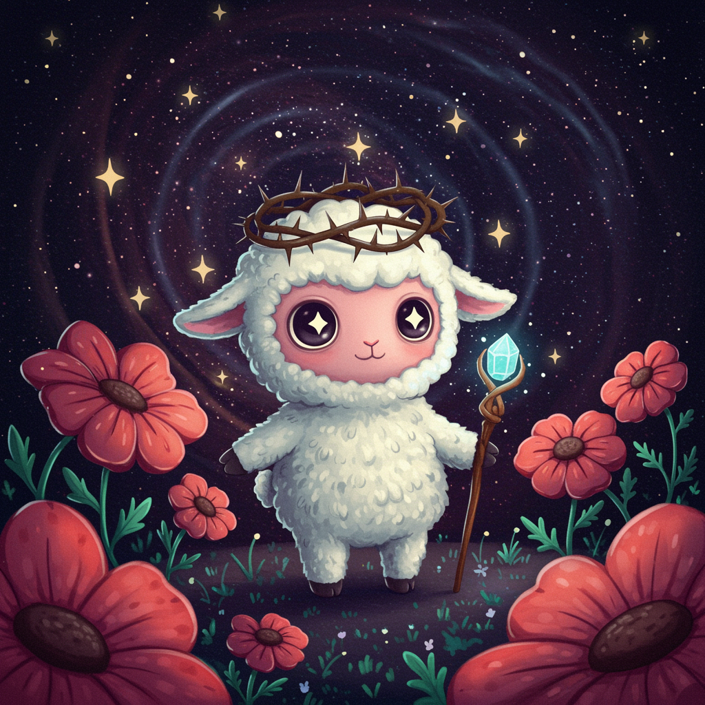 "Imagine a whimsical yet slightly eerie cartoon lamb donned in a tiny, intricately detailed crown of thorns, standing amidst a field of vibrant, oversized flowers that seem to whisper secrets from another realm. Its eyes twinkle with a mischievous glint, as if harboring ancient knowledge, and it clutches a small, ornate staff topped with a glowing crystal. The background is a swirling, celestial kaleidoscope of stars and shadows, suggesting a mystical gathering taking place beyond the mundane world. This image combines an innocent charm with an enigmatic aura, perfectly embodying the playful yet mysterious essence of ‘cult of the lamb pfp’."