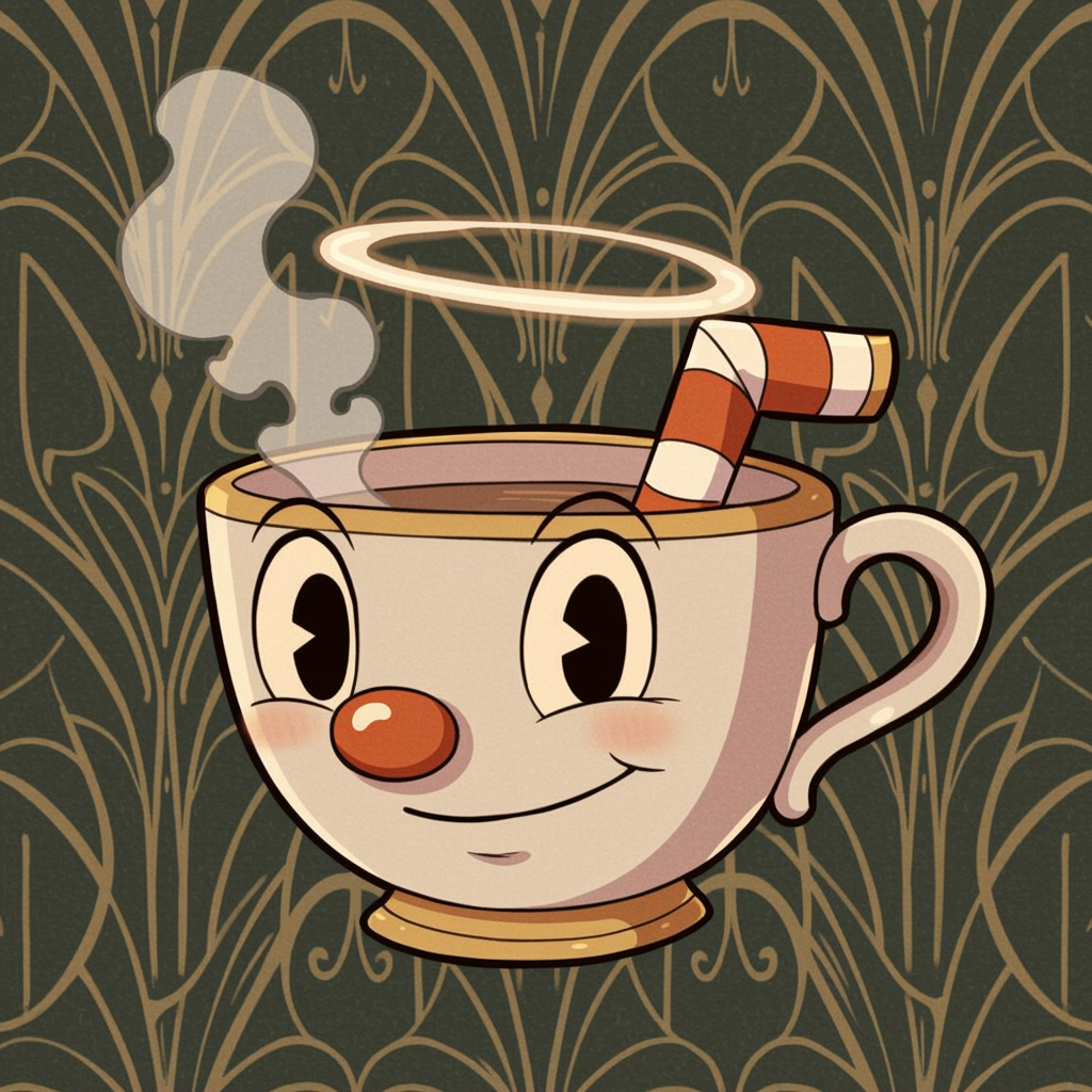"Imagine a whimsical profile picture featuring a spirited character from a 1930s-inspired animated universe; their face is a vintage porcelain teacup with a mischievous, wide-eyed expression, steam whimsically curling from the brim like a stylized halo against a backdrop of swirling, art deco patterns, capturing the vibrant and nostalgic essence of a 'Cuphead' adventure."