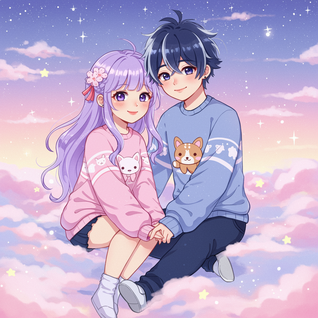 Imagine a delightful anime scene featuring a charming couple sitting together on a dreamy, pastel-colored cloud. The adorable pair are surrounded by soft, glowing stars and wisps of cotton candy mist. Their eyes sparkle with affection as they share a sweet, mischievous smile, hinting at a shared secret. She has silky, flowing lavender hair adorned with tiny sakura blossoms, while he sports a tousled, midnight blue hairstyle with silver highlights. Both are wearing cozy, pastel-colored sweaters decorated with cute animal motifs. The background is a serene, twilight sky with a gentle gradient from pink to indigo, dotted with twinkling stars and the subtle silhouette of a crescent moon. Their fingers are intertwined, radiating warmth and companionship that encapsulates the essence of a heartwarming bond.