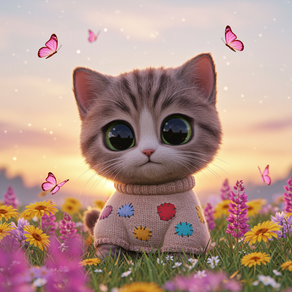 A whimsical scene featuring an adorable cartoon kitten with oversized, sparkling eyes, wearing a tiny, cozy sweater adorned with colorful patches; the kitten is playfully nestled in a field of vibrant wildflowers under a soft, pastel sunset, with fluttering butterflies surrounding it like floating jewels, exuding an aura of warmth and charm perfect for a profile picture that radiates cuteness.