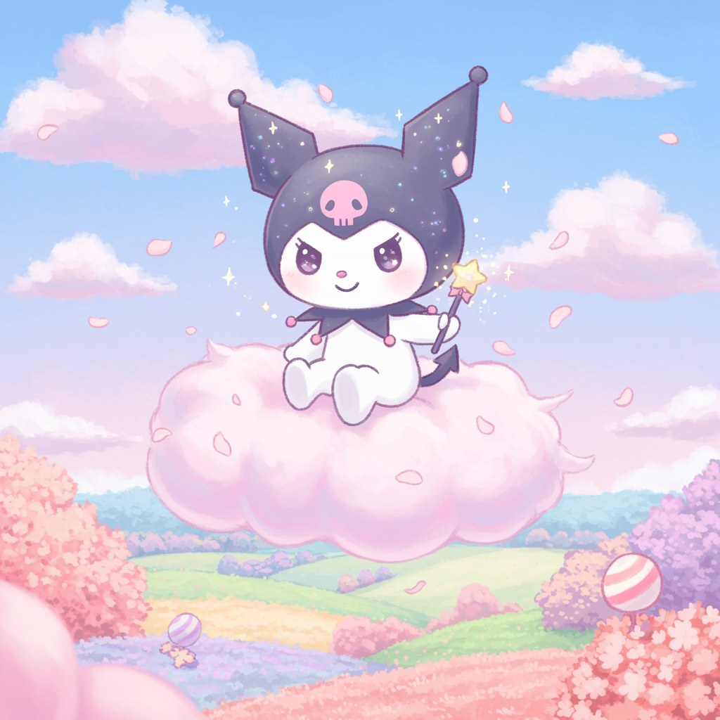 Imagine a whimsical world where a pastel-hued Kuromi, the mischievous kawaii character, sits atop a fluffy cotton candy cloud. Her signature jester hat is adorned with tiny sparkling stars that twinkle with a soft glow. Surrounding her are delicate cherry blossom petals that drift gently in a gentle breeze, creating a shower of pink and white. Below her, a dreamlike landscape of rolling hills and candy-colored forests stretches out, dotted with colorful, blooming flowers. The background features a serene sky dressing in soft gradients of lavender and baby blue, where dreamy clouds float lazily. Kuromi holds a tiny magic wand, and her eyes sparkle with playful mischief as if she's about to work her magic in this enchanting, cute aesthetic scene.