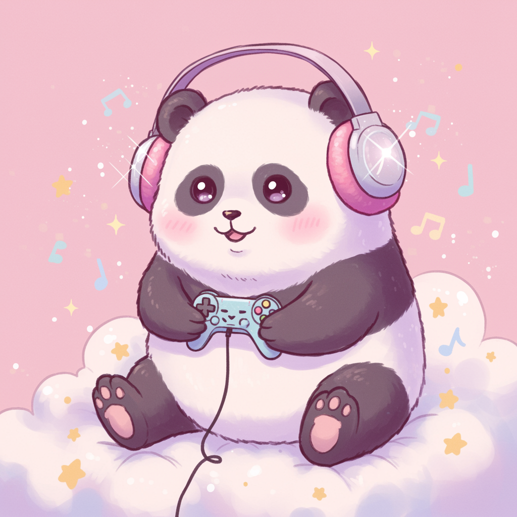 A whimsical illustration of a round-cheeked, pastel-colored chubby panda wearing oversized, sparkly headphones. The panda is sitting on a fluffy cloud surrounded by twinkling stars and tiny floating musical notes as it holds a gaming controller in its paws. Its eyes are wide and shimmering with curiosity and joy, perfectly capturing an adorable and playful vibe.