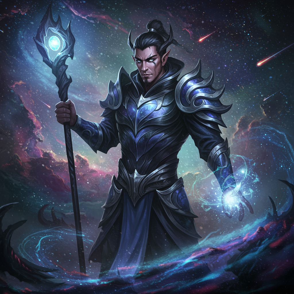 A mystical scene unfolds within a cosmic dreamscape where Dan Heng, the enigmatic wanderer, stands amidst swirling galaxies and shimmering nebulae. His gaze is both fierce and serene, embodying both wisdom and mystery. He is adorned in intricate, celestial-inspired armor with ethereal blue and silver hues that mirror the boundless universe around him. In his hand, he holds a staff pulsating with energy, casting an otherworldly glow upon his face, revealing eyes deep as the night sky and a faint, knowing smile. The background is a kaleidoscope of stardust patterns, with shooting stars tracing paths of destiny.