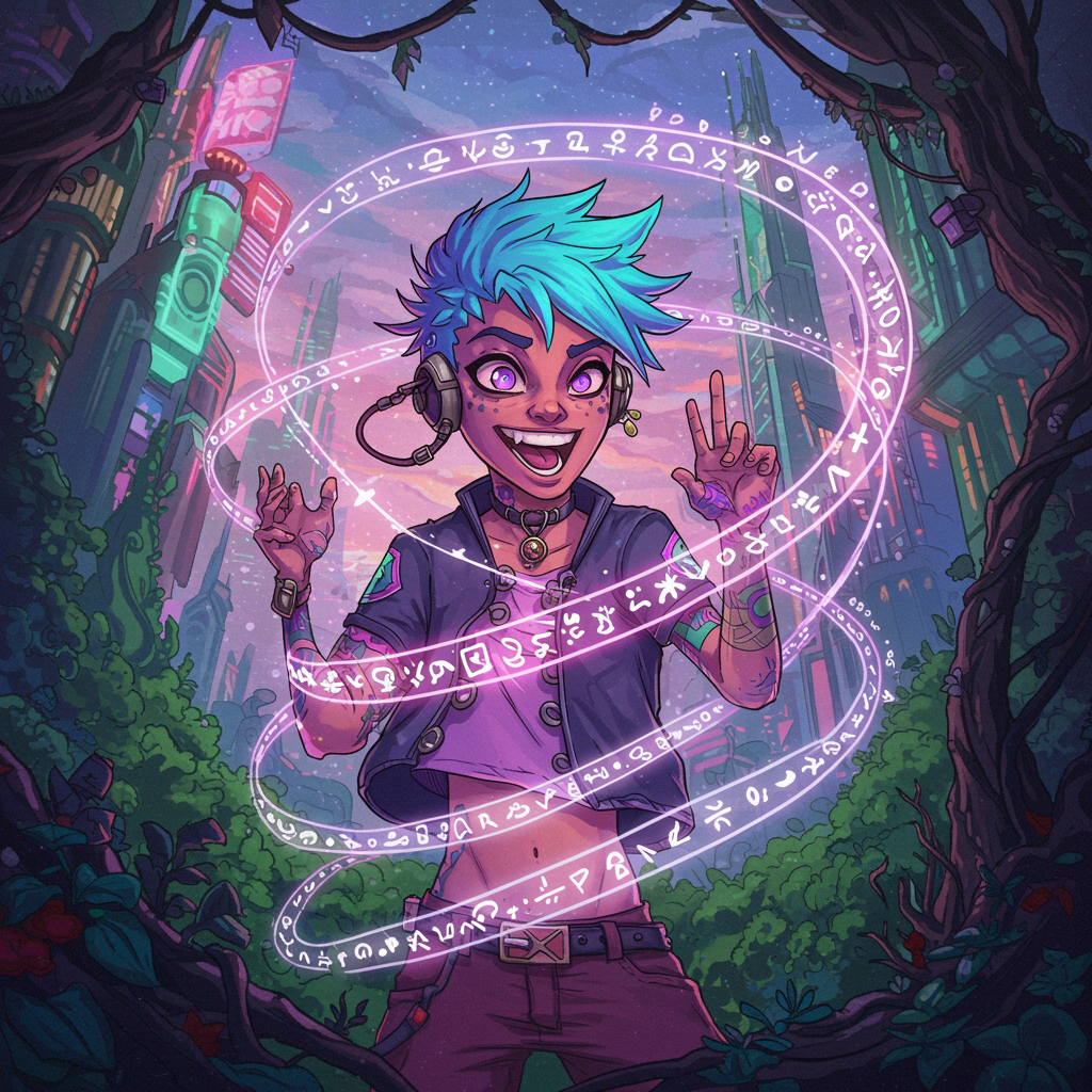 An intriguing pfp featuring a whimsical blend of cyberpunk and fantasy elements, showcasing a vibrant character with neon-colored hair and digital tattoos, wrapped in a swirling aura of pastel-colored lights and mystic symbols, their expression reflecting a sense of adventure and mischief as they stand amidst a backdrop of towering futuristic cityscapes intertwined with overgrown enchanted forests, embodying the spirit of the dandadan universe with a unique, otherworldly flair.