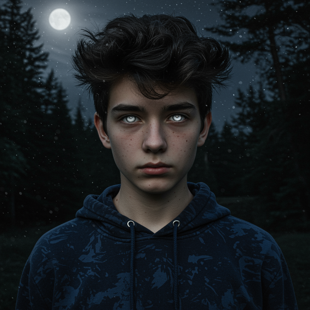 A mysterious teenage boy with striking silver eyes and tousled midnight-black hair, standing against a backdrop of a moonlit forest. His expression is enigmatic and thoughtful, with shadows cast across his face creating an aura of intriguing darkness. He's wearing a deep navy hoodie with subtle abstract patterns that seem to weave in and out of existence, blending with the dimly lit environment. Flecks of starlight catch in his gaze, adding an ethereal glow that hints at hidden depths and untold secrets. This image captures a blend of brooding mystery and haunting charm, perfect for a dark-themed profile picture.