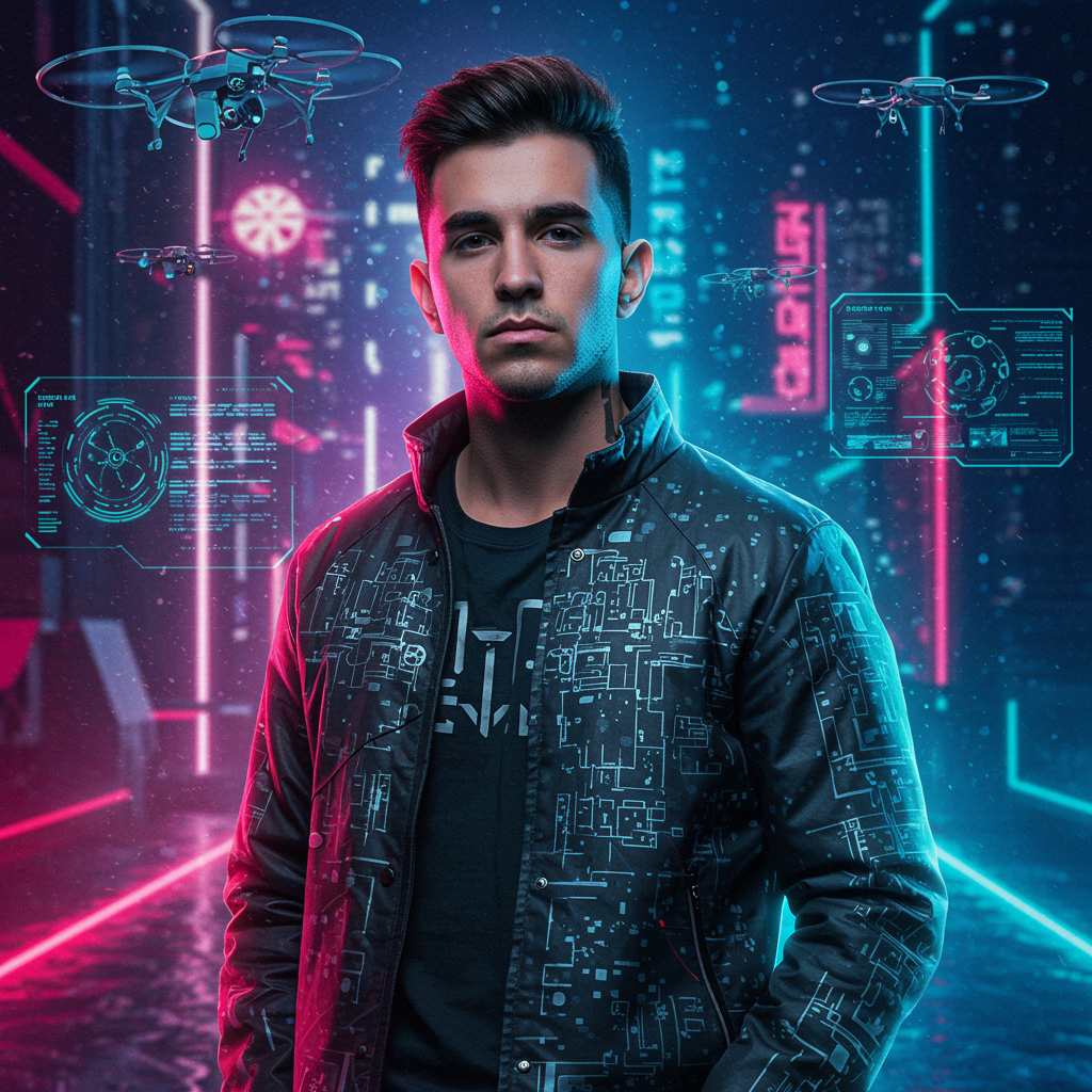 A futuristic urban landscape illuminated by neon lights, where a confident young man with striking features stands at the center, wearing a sleek cybernetic jacket adorned with digital patterns. His expressive eyes, reminiscent of David Martinez's bold determination, convey a sense of adventure and resilience. In the backdrop, hovering drones and interactive holograms create a lively atmosphere, while a digital skyline reflects his stylish silhouette, encapsulating a dynamic profile perfectly suited for an audacious social media presence.