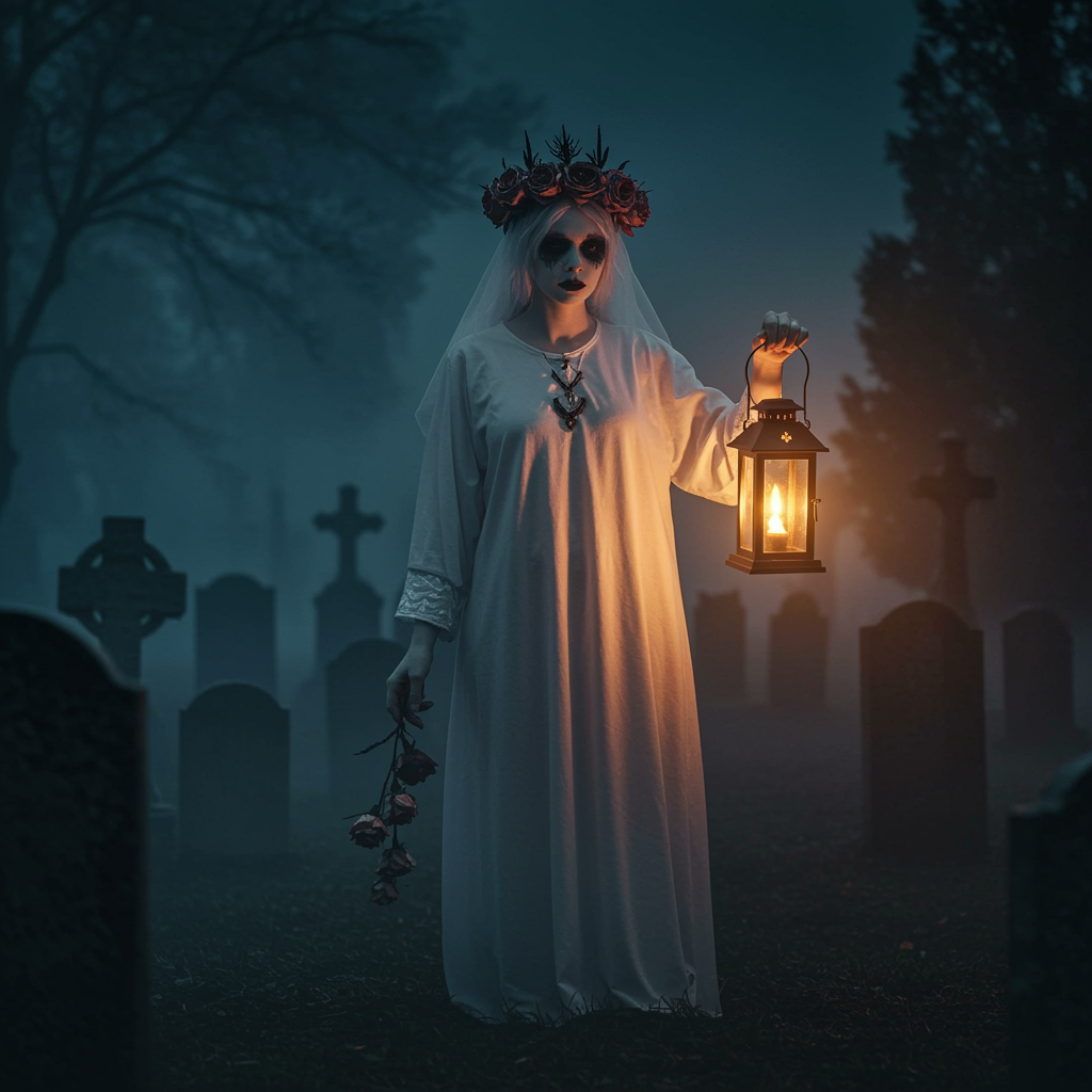A surreal profile picture capturing the essence of "death pfp": A ghostly figure standing in a moonlit cemetery, its transparent form merging with the mist, wearing a crown of withered roses and holding a flickering lantern that casts shadows of forgotten memories, evoking a hauntingly beautiful yet serene presence amidst the silent tombstones.