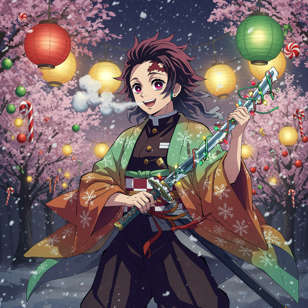 A festive and enchanting image capturing a Demon Slayer character dressed in a vibrant, traditional Japanese kimono adorned with snowflake patterns, standing against a backdrop of softly falling snow. Their breath forms delicate clouds in the crisp winter air, while vibrant red and green holiday lanterns glow warmly above, casting festive hues. In their hand, a sword gleams with a shimmering frost edge, intertwined with elegant ribbons and tiny, sparkling Christmas lights. Around them, cherry blossom trees are aglow with colorful ornaments and candy canes hang playfully from their branches, creating a magical blend of mythic warrior spirit and holiday cheer. Their expression is one of fierce determination yet softened by a joyful, festive sparkle in their eyes. This image perfectly blends the mystical world of Demon Slayer with the warmth and charm of the holiday season, making it an ideal avatar for celebrating Christmas with a touch of anime flair.