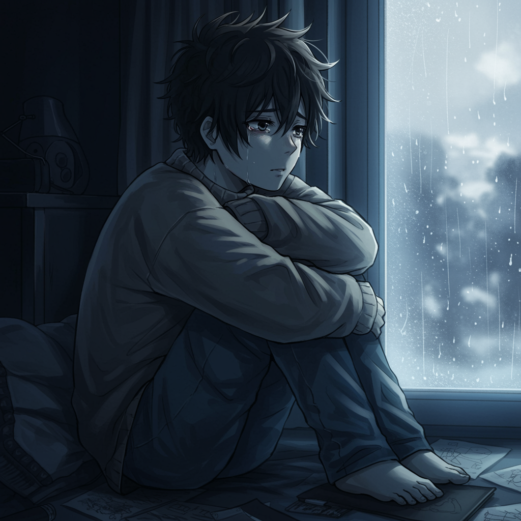 In a dimly lit room, a young anime boy with tousled dark hair sits hunched over, enveloped in an oversized sweater. His somber eyes, shimmering with unspilled tears, gaze pensively out a rain-streaked window that reflects a world in grayscale. Soft, melancholic blue hues surround him, emphasizing the quiet solitude and the weight of unspoken stories behind his forlorn expression. Scattered papers and a forgotten sketchbook lay around him, hinting at a world he once created but now leaves untouched.