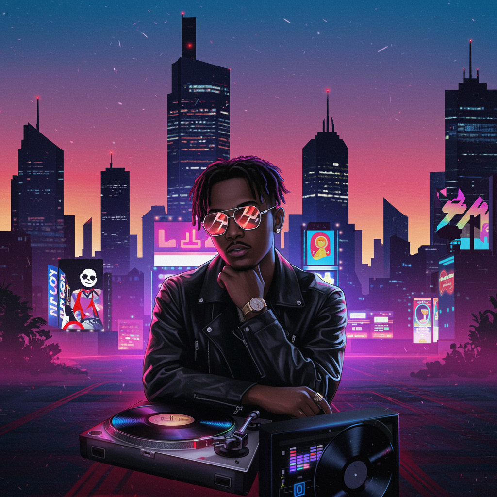 Create an image of a futuristic city skyline silhouetted against a glowing, neon-hued twilight sky with tall skyscrapers illuminated by vibrant digital billboards featuring abstract pop culture icons; in the foreground, a young, stylish individual, wearing a sleek leather jacket and reflective sunglasses, stands leaning on a classic vinyl record player, symbolizing both retro and digital aesthetics blending; the scene captures an essence of cool confidence and modern nostalgia perfectly, encapsulating the spirit of "diddy pfp" for an eye-catching profile picture.