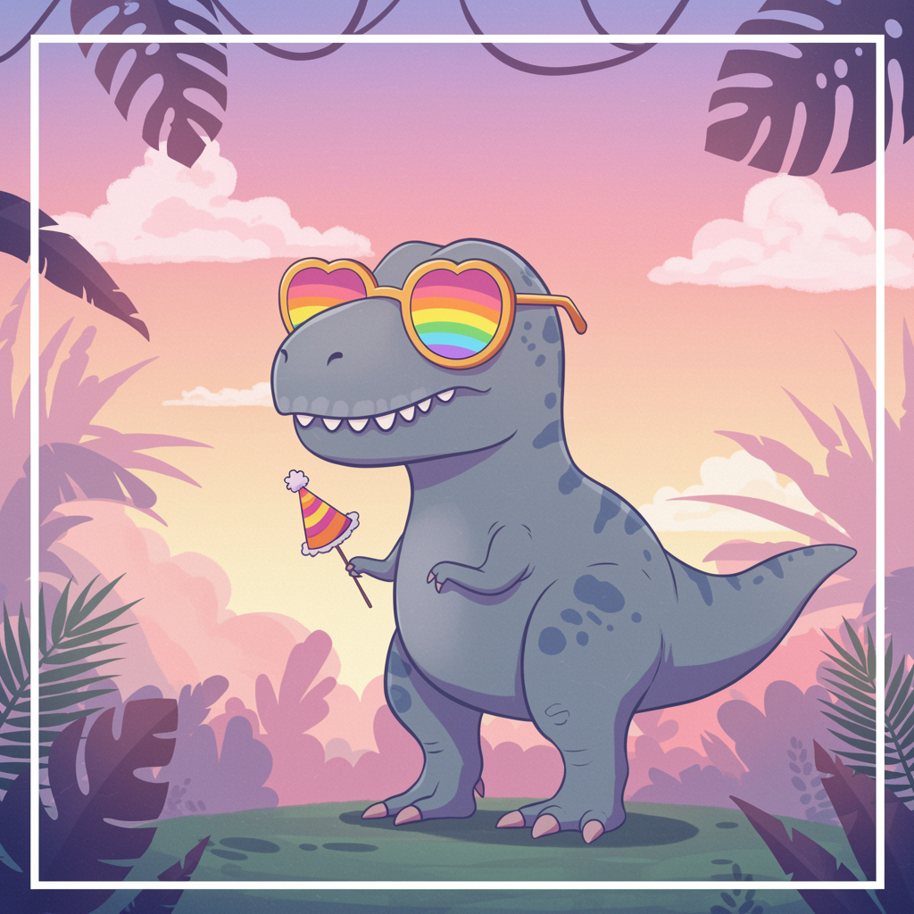 Create a vibrant and whimsical dinosaur pfp featuring a friendly, cartoonish T-Rex sporting a pair of retro sunglasses with rainbow reflections. The T-Rex is playfully holding a tiny, colorful party hat in its tiny arms, surrounded by a lush, prehistoric jungle backdrop with oversized leaves. The sky is an explosion of pastel colors resembling a dreamy sunset, adding a touch of magic to the scene. This quirky and fun dinosaur encapsulates a sense of adventure and personality, perfect for a standout social media profile picture.
