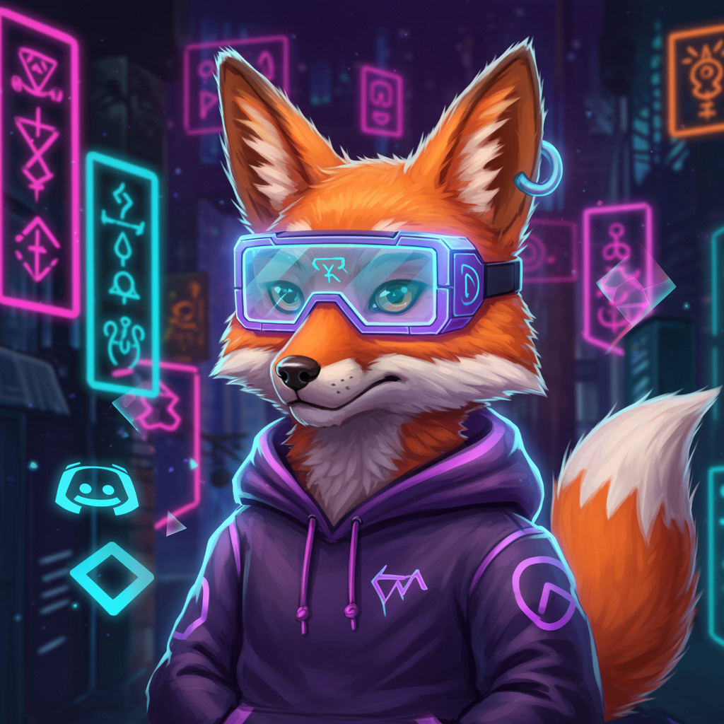 A whimsical cyberpunk fox wearing futuristic goggles and a neon hoodie, with a backdrop of a digital cityscape, glowing neon signs with mystic symbols, and abstract holographic shapes floating around, capturing the essence of virtual reality and the vibrant community spirit of a Discord server.