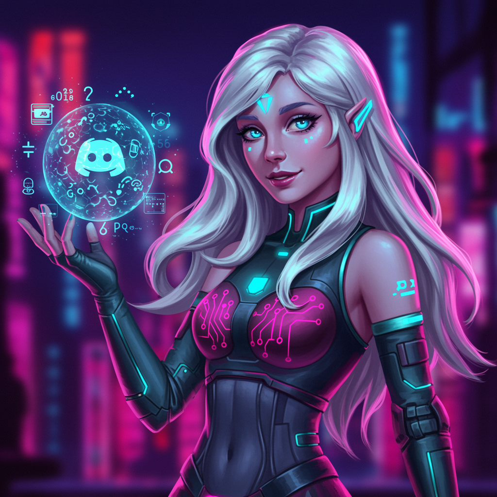 Imagine a vibrant, otherworldly scene where a digital goddess, with flowing silver hair that shimmers like mercury, stands against a backdrop of neon-lit cityscapes. Her eyes, a mesmerizing shade of electric blue, exude wisdom and playfulness. She wears a futuristic outfit adorned with glimmering circuits and gleaming metallic accents, reflecting hues of magenta and cyan. In her hand, she holds a translucent, holographic orb swirling with animated symbols, representing the vast universe of online interactions. This captivating character's aura blends mystery and warmth, perfect for embodying the spirit of a Discord community queen.