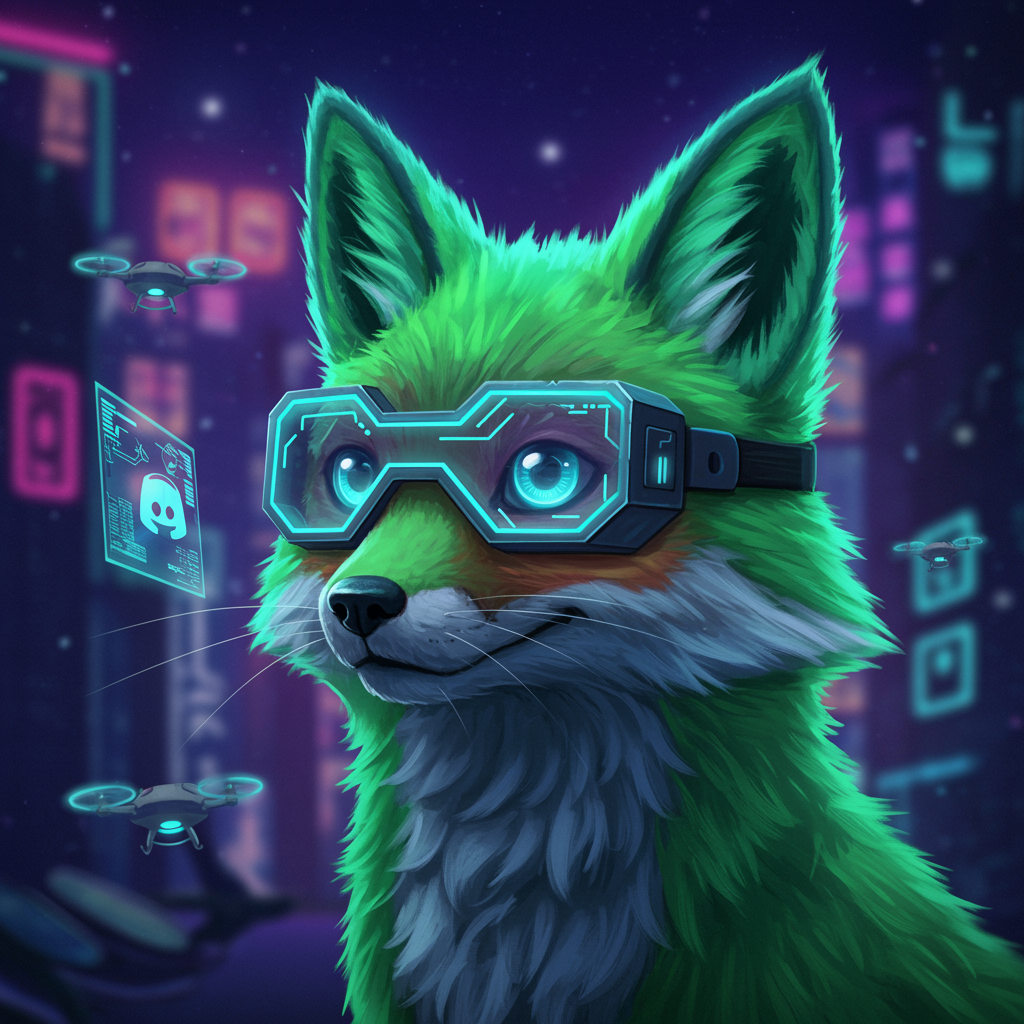 Imagine a whimsical digital avatar for a Discord profile, featuring a quirky cyberpunk fox with luminous green fur and neon blue eyes, wearing a pair of high-tech goggles. The background is a futuristic cityscape where holograms and neon lights illuminate the night, and tiny floating drones buzz around. This fox embodies both mischief and mystery, with a slight smirk on its face, suggesting it's ready for digital adventures in virtual realms.