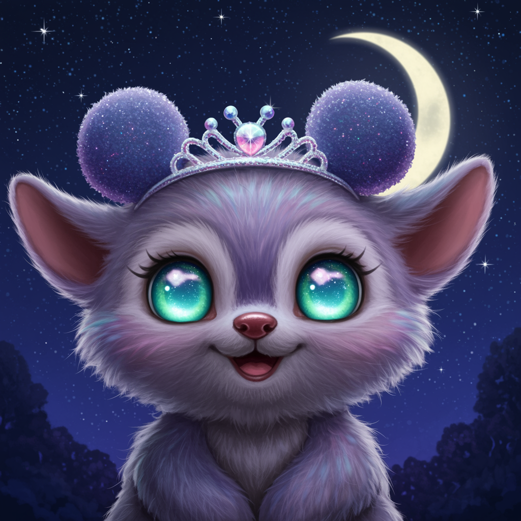 Create an enchanting Disney-style profile picture featuring a whimsical character with oversized, expressive eyes and a captivating smile, set against a backdrop of twinkling stars and a crescent moon. The character, a friendly woodland creature with a tuft of vibrant colors on its fur, wears a tiny tiara shaped like Mickey Mouse ears. Its eyes reflect an aurora borealis, blending hues of blue, green, and pink, capturing the magic and wonder of a Disney fairytale night.