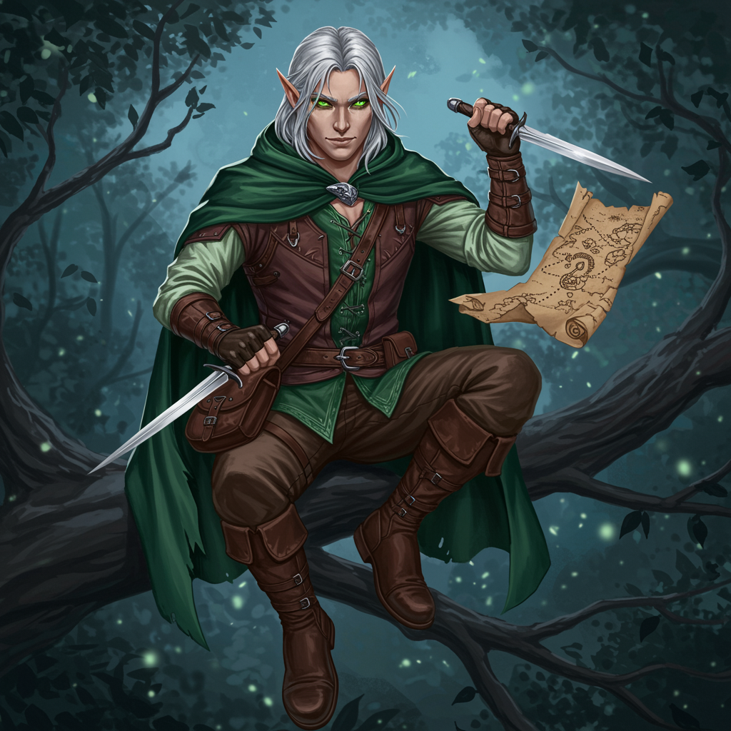 A dashing elf rogue with silver hair and piercing green eyes, perched on a moonlit forest branch; shimmering shadows dance around, reflecting the mischievous twinkle in their eye as they hold a gleaming dagger, a mysterious ancient map peeks from their leather satchel, evoking intrigue and a sense of adventure for the ultimate D&D-inspired profile picture.