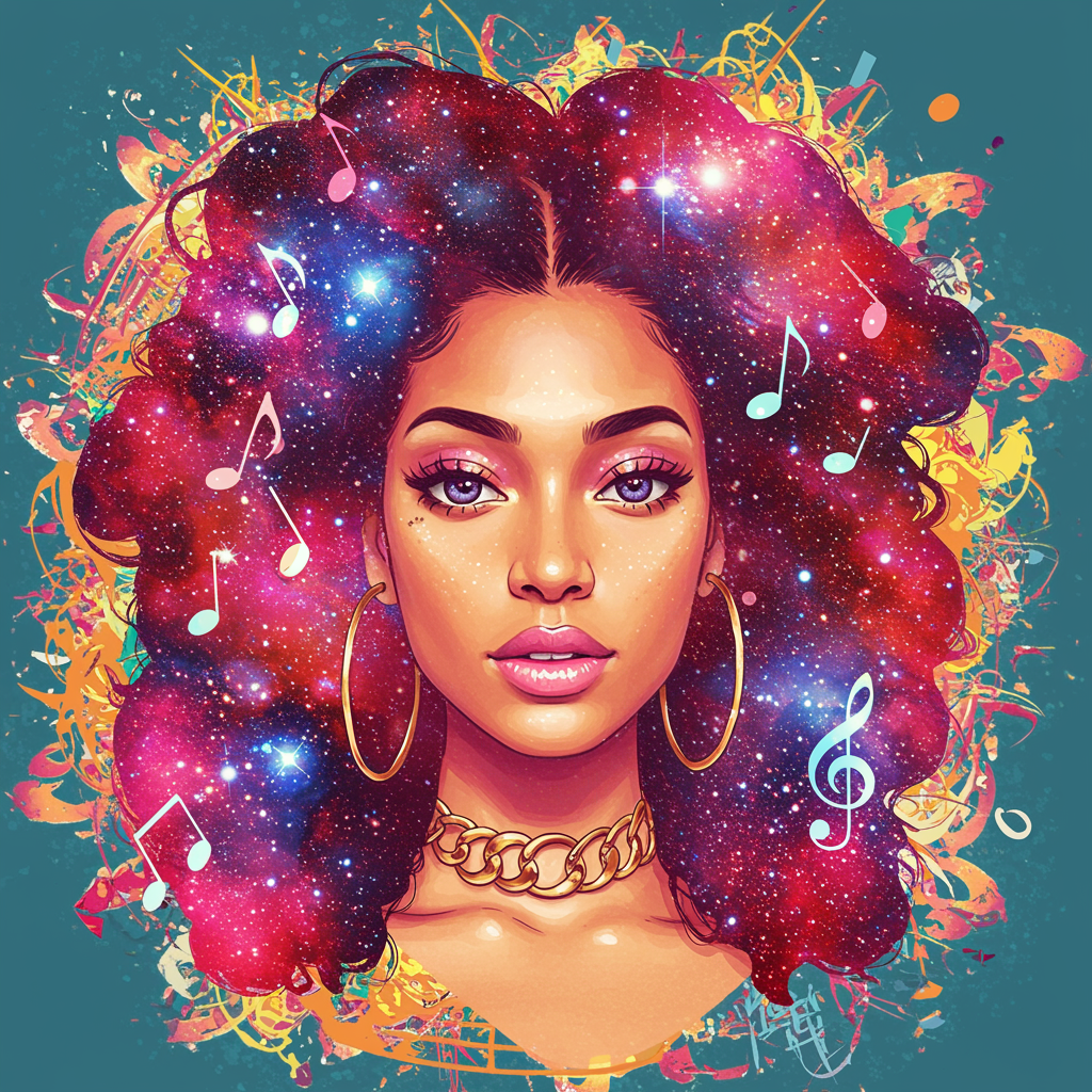 Imagine a vibrant, surreal portrait of Doja Cat, where her iconic features are playfully intertwined with cosmic elements. Her hair cascades into a kaleidoscope of galaxies and stars, while musical notes float around, hinting at her artistic prowess. Her eyes sparkle like distant nebulae, reflecting a sense of mystery and allure. The background is an abstract fusion of colorful swirls and dynamic patterns, encapsulating her unique style and energy. This image captures the essence of Doja Cat as a celestial being, a blend of music, creativity, and cosmic wonder, perfect for an eye-catching, dynamic pfp.