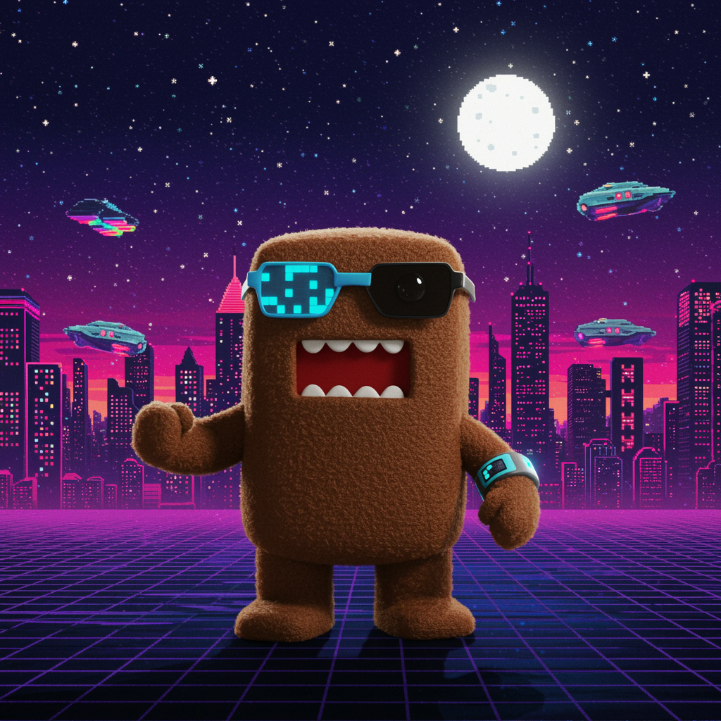Imagine a digital avatar where Domo, the quirky and lovable brown monster, is transformed into a futuristic, pixelated art style. Picture Domo standing with a dynamic pose against a vibrant, pixelated neon cityscape with glowing skyscrapers and bustling hovercrafts. The background should feature an 8-bit night sky filled with twinkling stars and a full moon, adding a sense of wonder and nostalgia. Domo, sporting cool techno-glasses and a sleek digital wristband, exudes a confident yet playful vibe, creating the perfect blend of retro and modern for a profile picture that stands out in the digital realm.