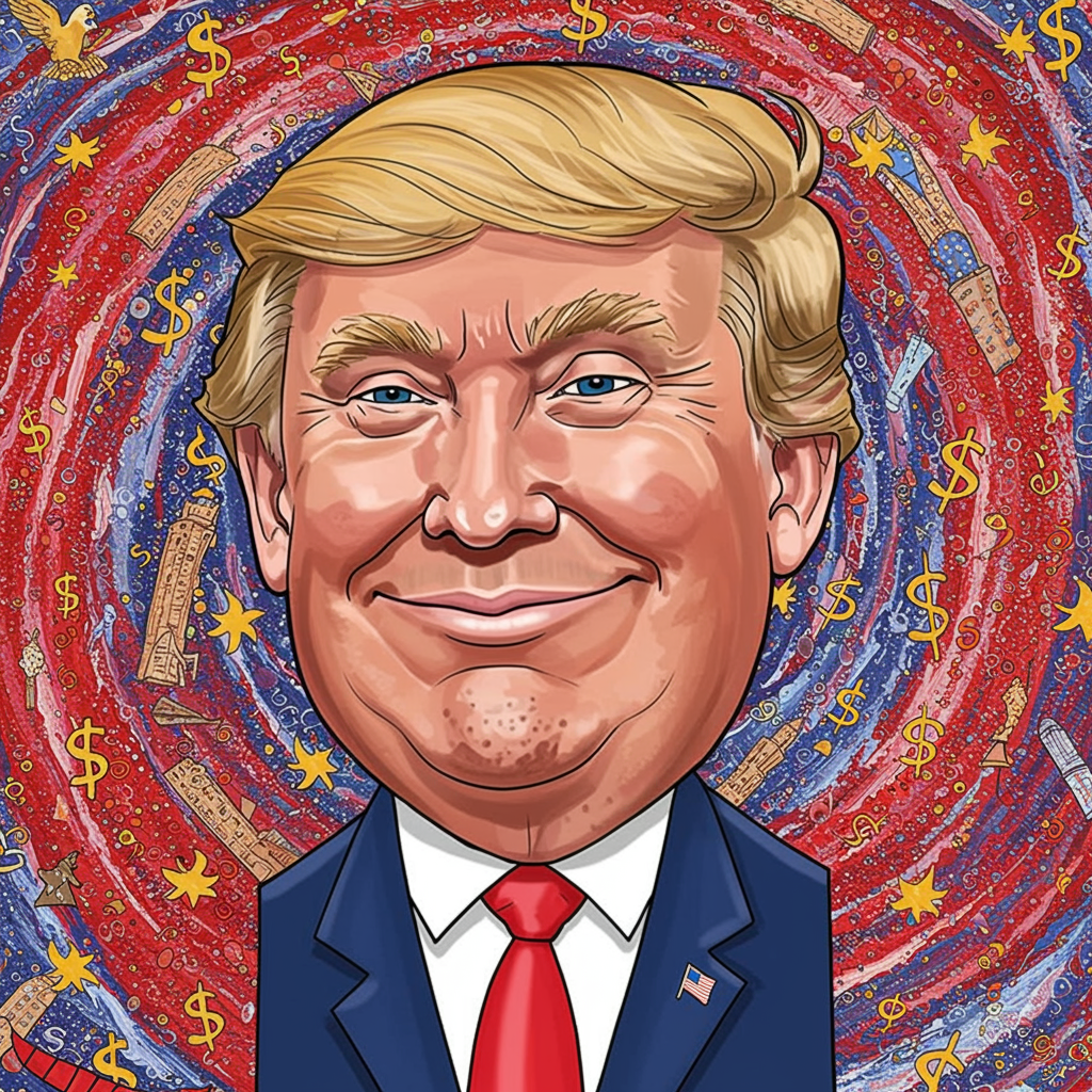 A whimsical digital art piece featuring a cartoon version of Donald Trump with exaggerated features and a charismatic yet playful expression, set against a vibrant background of swirling red, white, and blue abstract patterns, incorporating tiny iconic symbols such as golden eagles, skyscrapers, and dollar signs subtly woven into the tapestry, all designed to convey a larger-than-life personality while maintaining a light-hearted, approachable feel suitable for a profile picture.