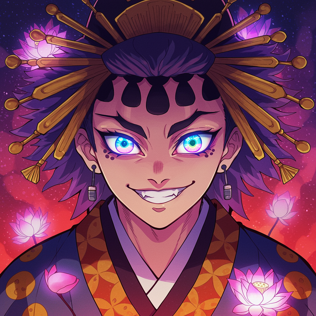 A vibrant and enigmatic portrayal of Douma from the Demon Slayer series, captured in a close-up shot with his striking heterochromatic eyes gleaming with an otherworldly glow. His distinctive rainbow eyes exude a mysterious allure, while his sharp and cunning smile adds a touch of mischievous charm. The background swirls with ethereal colors and faint images of lotus flowers, symbolizing his sinister yet captivating nature. The intricate details of his ornate headdress and kimono are highlighted, showcasing an exquisite blend of traditional Japanese aesthetics with a gothic twist, making it a perfect blend of elegance and darkness.
