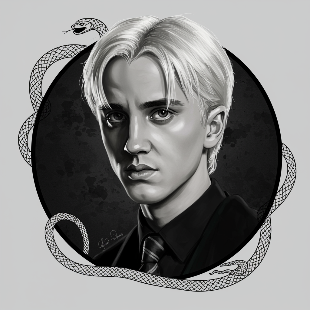 Envision a black and white portrait of Draco Malfoy that captures both his regal arrogance and hidden vulnerability; his platinum blonde hair glistens like spun silver under moonlight, while his sharp, contemplative gaze, framed by shadows, reveals the depth of a complex character. A subtle serpent motif weaves around the border, symbolizing his Slytherin legacy, as a single, ethereal light source highlights his distinct features, suggesting a hint of redemption in this enigmatic and mesmerizing pfp.