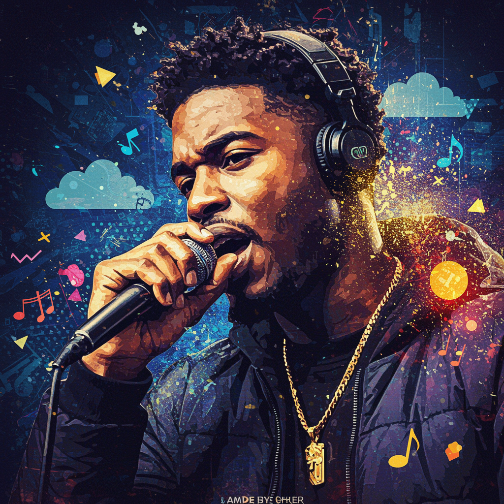 Imagine a digital mosaic portrait of a modern hip-hop artist, with the iconic silhouette of a singing microphone in hand, seamlessly merging with colorful visual elements like music notes, clouds, and playful geometric shapes. The image is layered with textures reminiscent of digital video glitches, creating a dynamic and edgy atmosphere. The vibrant hues of blues, purples, and golds cast a dramatic contrast, encapsulating the essence of rhythm, energy, and creativity. This pfp embodies the spirit of music video culture, with subtle nods to urban style and digital artistry.