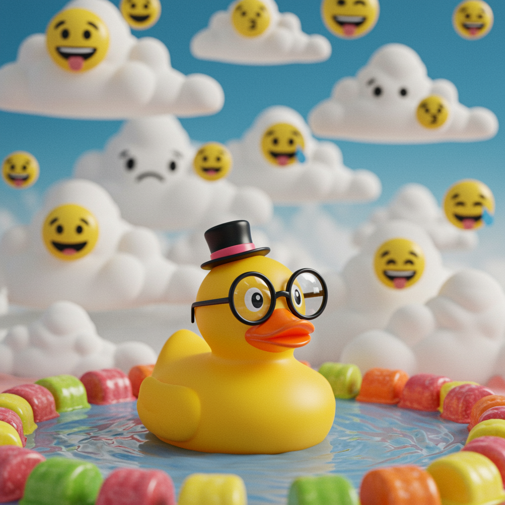 Create an image of a rubber duck wearing oversized glasses and a tiny top hat, floating on a small pond made of candy with exaggerated, cartoonish facial expressions that convey a sense of goofy joy and whimsy amidst a backdrop of surreal, dreamy clouds shaped like various emoji faces.